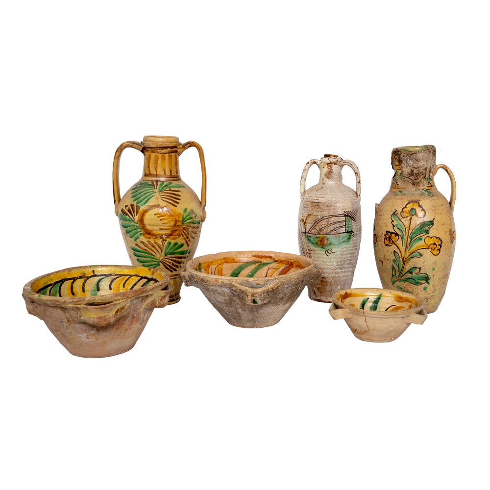 Tre quartare e tre lemmi in ceramica smaltata e decorata (rotture e usure).