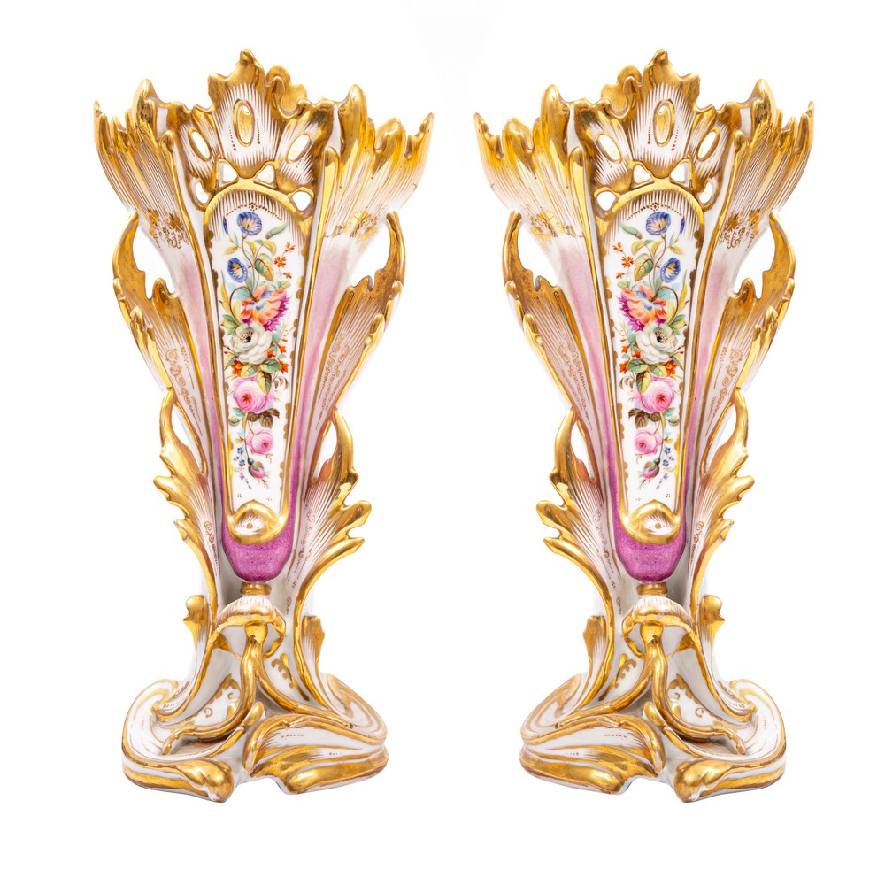 COPPIA VASI Luigi Filippo in porcellana bianca dipinta a motivo floreale e fogliaceo, lumeggiature in oro (usure).