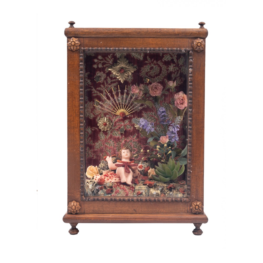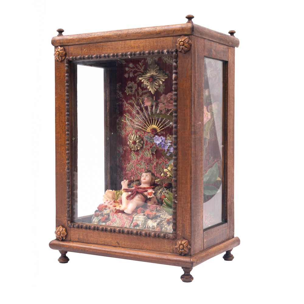 Bambinello in cera con decorazioni in corallo entro teca in legno.