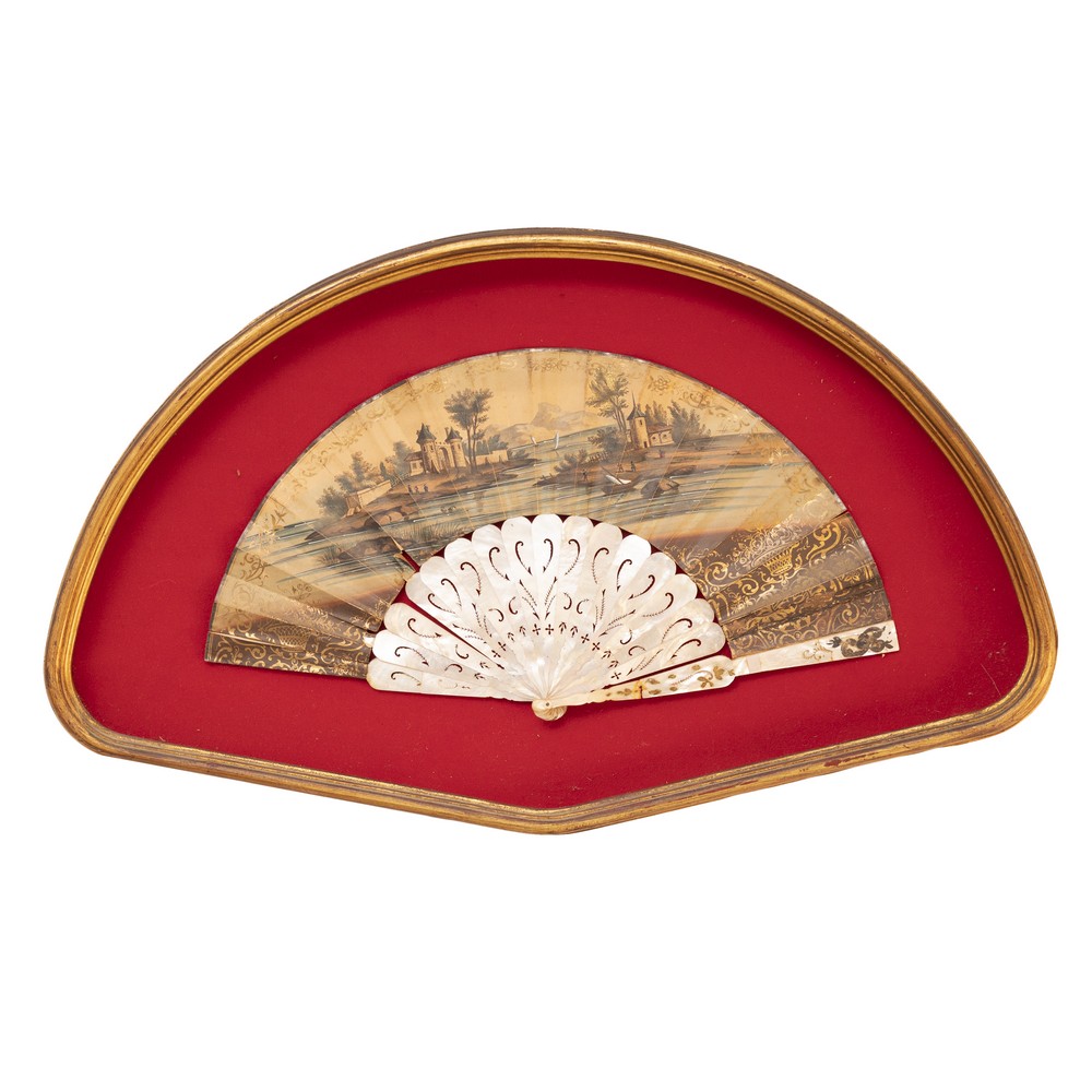 dipinta, raffigurante 'Paesaggio fluviale con personaggi', con stecche in madreperla entro ventagliera in legno dorato.