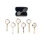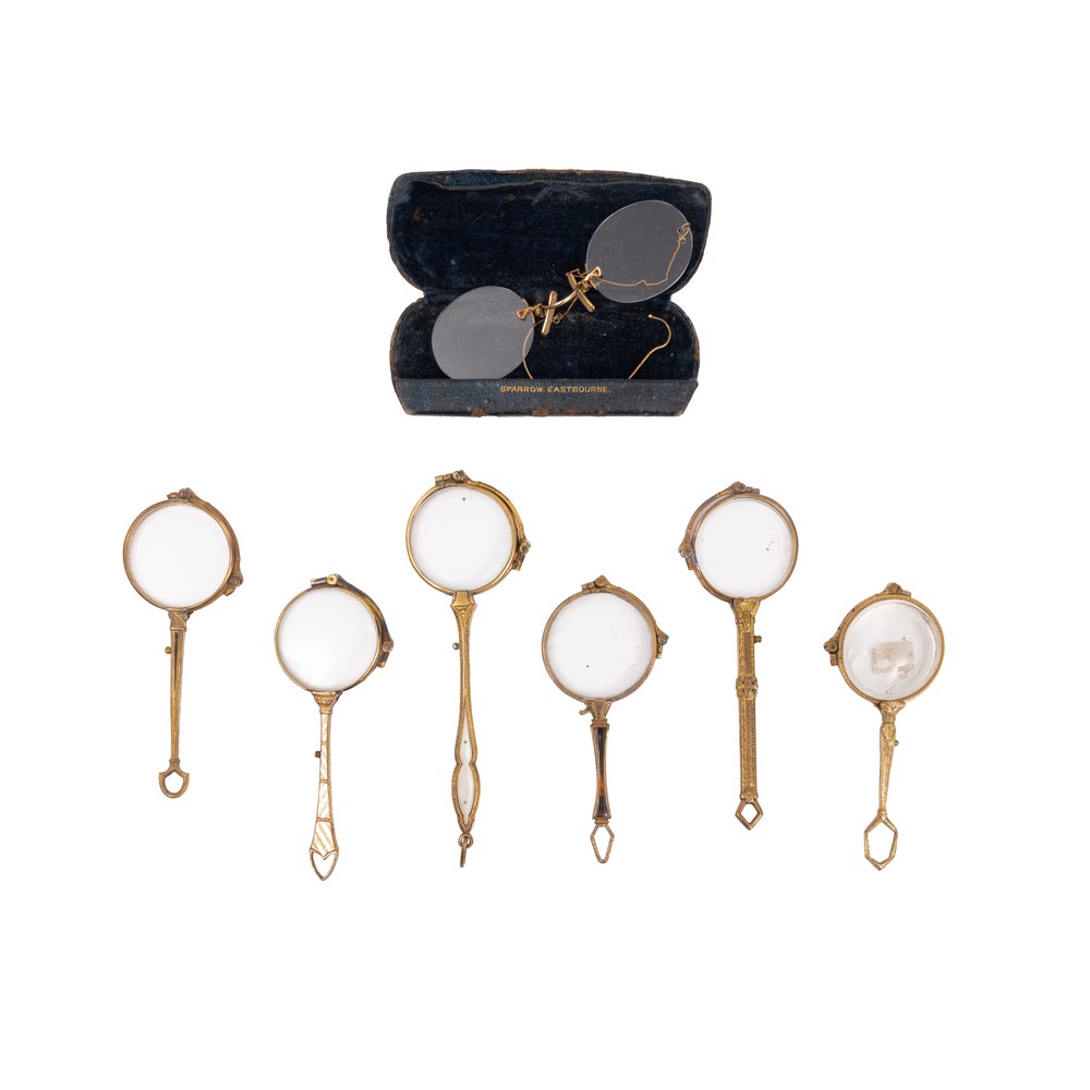 Sei lorgnette con impugnatura, in oro basso titolo, e occhialini in oro.
