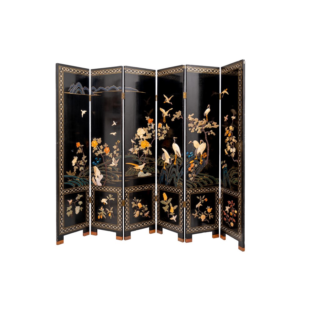 SEPARÈ a sei ante in legno laccato con tarsie in madreperla con composizione in pietre dure a motivo floreale e fogliaceo con volatili.
