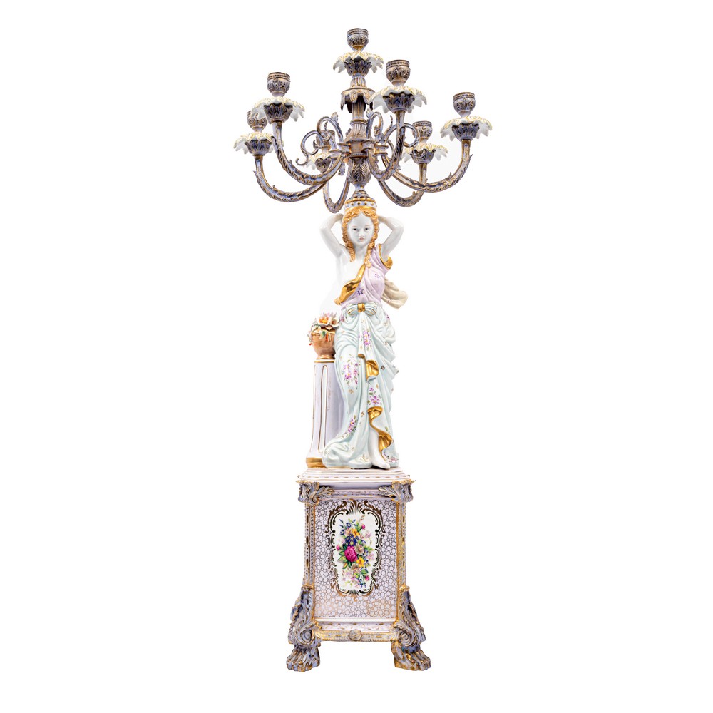 FLAMBEAUX a sette luci in metallo e ceramica policroma e decorata a motivi floreali lavorata a guisa di fanciulla (marchio alla base).