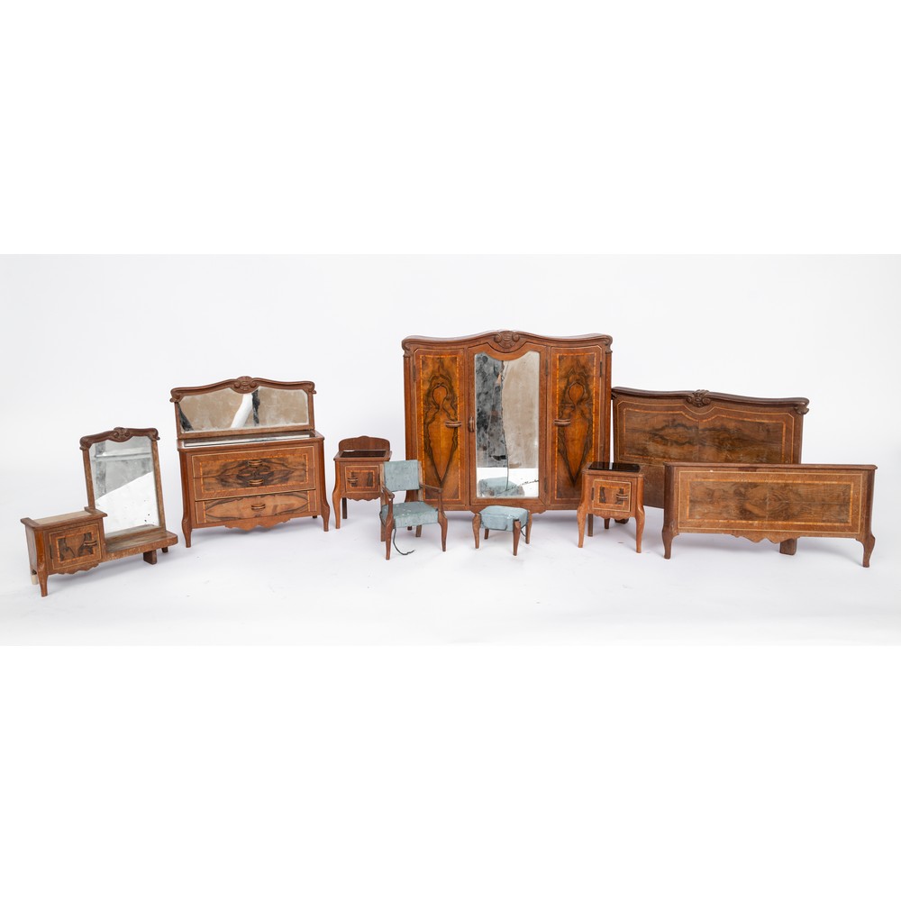 STANZA IN MINIATURA composta da cassettone a tre cassetti con specchiera, armadio a tre ante, due comodini, toletta, due poltrone, pouff ed un letto in radica di noce, mogano e perfili in bois de rose e bosso (restauri, mancanze e usure).