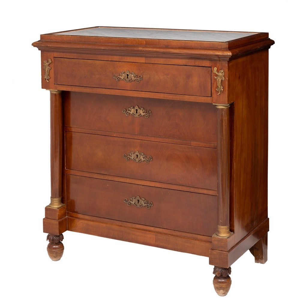 CASSETTONE tardo Impero in legno di mogano con quattro cassetti e piano in marmo bianco incassato.