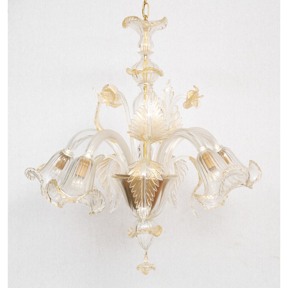 LAMPADARIO in vetro di murano a cinque luci nei toni del bianco e oro.