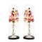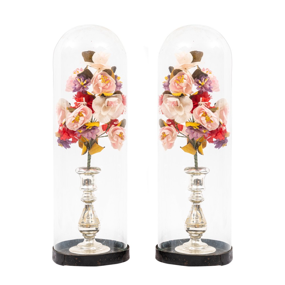 COPPIA DI CANDELIERI in opaline decorato con composizioni floreali in tessuto entro campane in vetro.