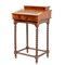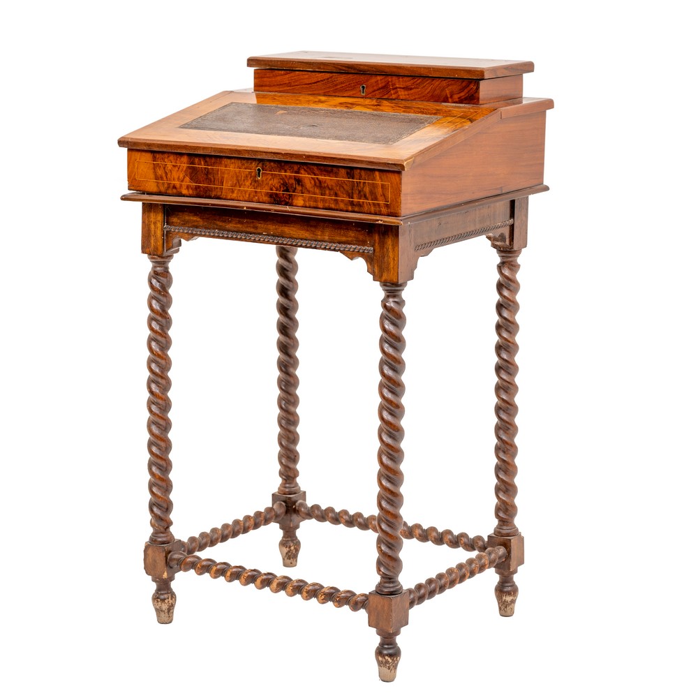 PICCOLO SCRITTOIETTO con portacarte nella parte superiore in legno di noce e radica, piano in pelle e gambe a torcion.