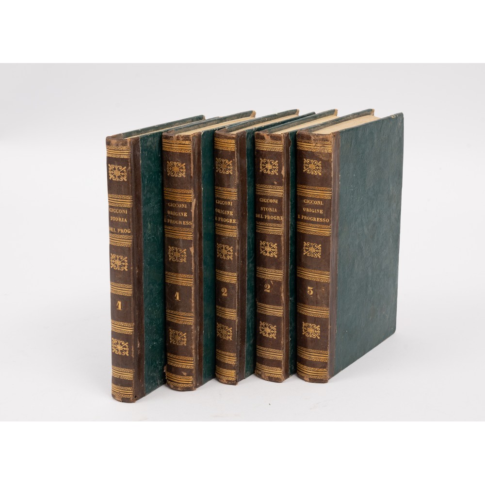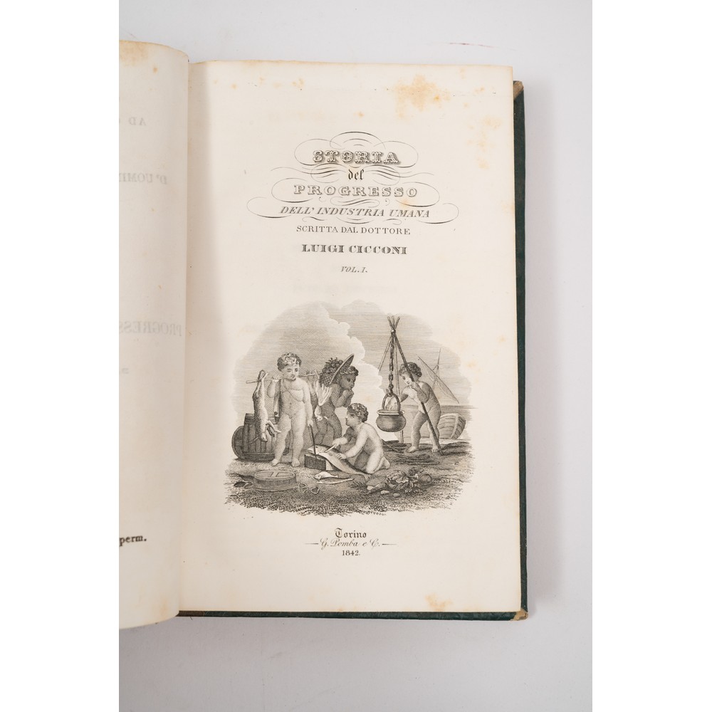 CINQUE VOLUMI DI Luigi Cicconi : 1) “Storia del Progresso dell’Industria Umana”, ed. G. Pomba e C., Torino 1842. In 2 volumi. In 16°. Due belle xilografie del Bonatti ai frontespizi. Rilegature in mezza pelle con titoli e fregi in oro ai dorsi. Piatti rigidi fiorati. Tagli spruzzati e colorati. Leggere bruniture e fioriture sparse . Pp. XXIII, 263; XII, 359. 2) “Origine e Progresso della Civiltà Europea”, ed. G. Pomba e C., Torino 1842 - 1843. In 3 volumi. In 16°. Rilegature in mezza pelle con titoli e fregi in oro ai dorsi. Due belle xilografie di Gandolfi e Doyen ai frontespizi. Piatti rigidi fiorati. Tagli spruzzati. Leggere bruniture e fioriture sparse Pp. XXIII, 364; XVI, 303; XV, 445.