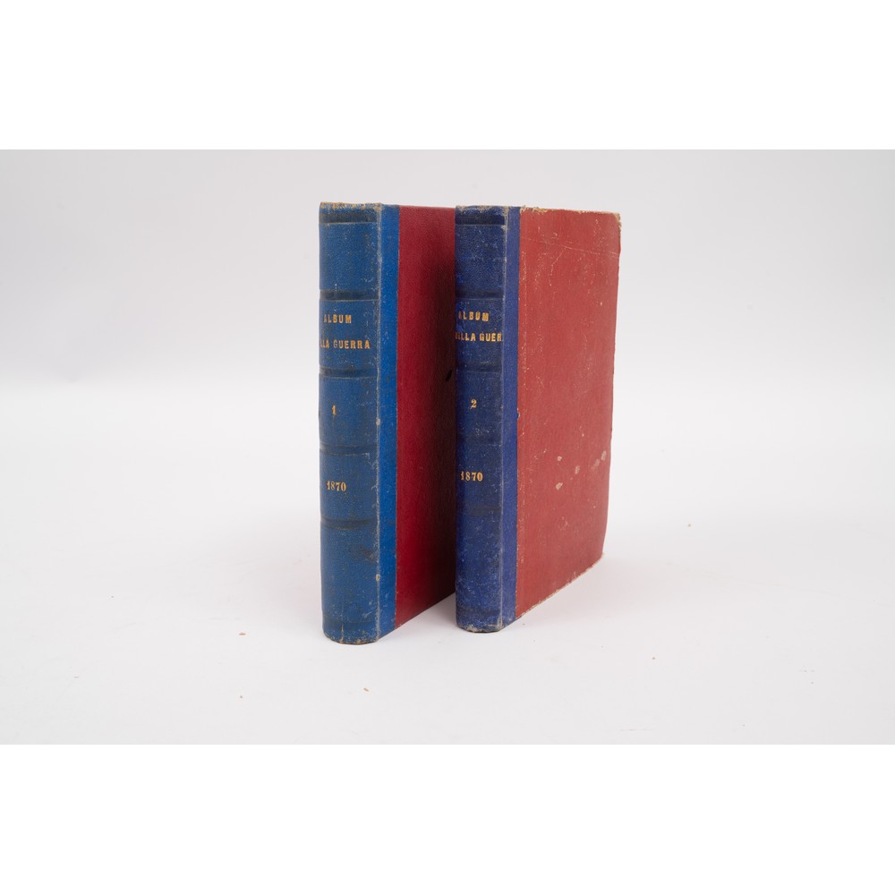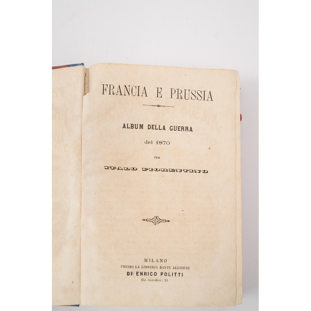 Italo Fiorentino “ Francia e Prussia. Album della guerra del 1870”, ed. Enrico Politti, Milano 1870. In 8°. 2 volumi. Legature in mezza tela con titoli in oro ai dorsi e piatti cartonati. Bella xilografia alle antiporte con scene di guerra e numerose illustrazioni n. t. anche a doppia pagina. Pp. 776 (vol. 1); 528 (vol.2). Con la straordinaria tavola alla pag. 51 del vol. 1 più volte ripiegata con il teatro di guerra.