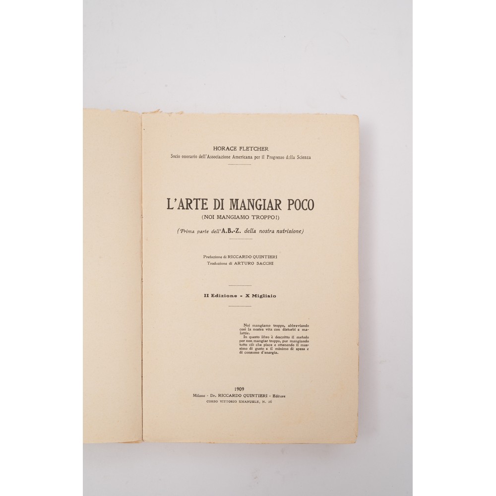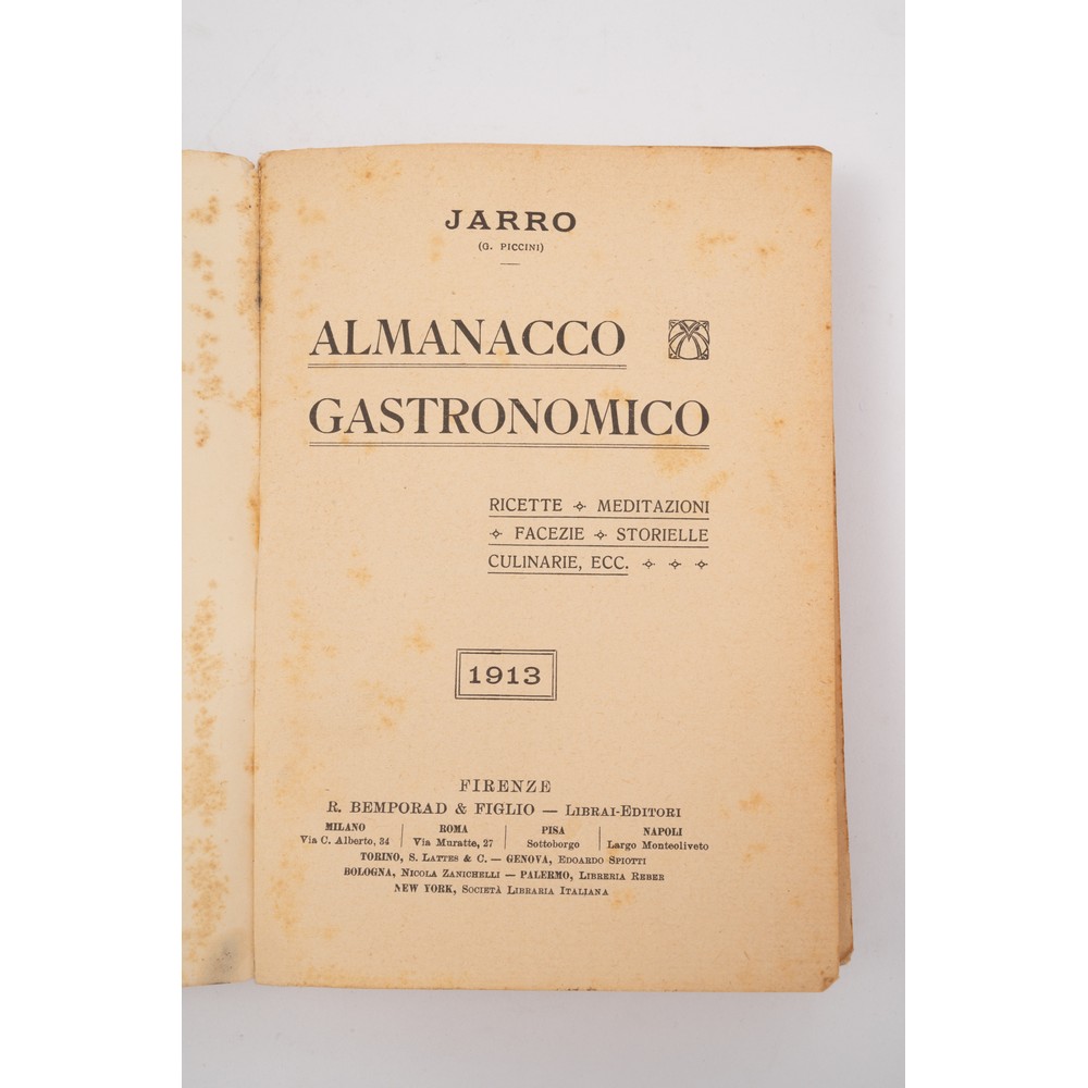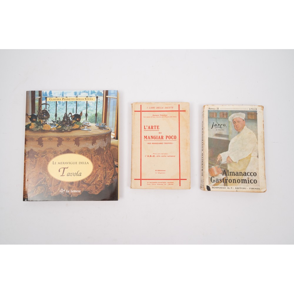 TRE VOLUMI SULL’ARTE DEL MANGIARE: 1) Claudia Pianetti della Stufa “Le meraviglie della tavola”, ed. Le Lettere 1999. In 8° carré. Legatura editoriale rigida in tela cartonata e sopraccoperta editoriale illustrata. Stampata in carta patinata. Pp. 189. 2) Horace Fletcher “L’arte di mangiar poco”, ed. Riccardo Quintieri, Milano 1909. Brossura editoriale flessibile. Copertina e dorso con i titoli stampati in rosso. Tagli in barbe. Pp. XX, 215, (5). 3) Jarro ( G. Piccini) ALMANACCO GASTRONOMICO, ed. Bemporad 1913. In 8°, brossura editoriale illustrata. Pp. 197. In ottima condizioni con carte ancora fresche. Una piccola macchia di inchiostro al taglio basso della copertina. € 30,00. Valutazione € 90,00 / 100,00.