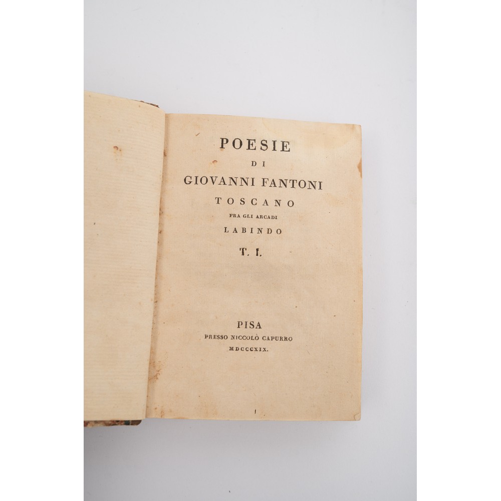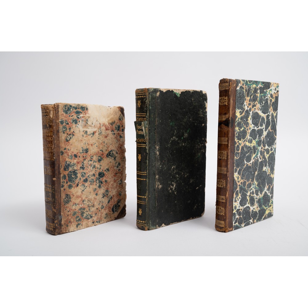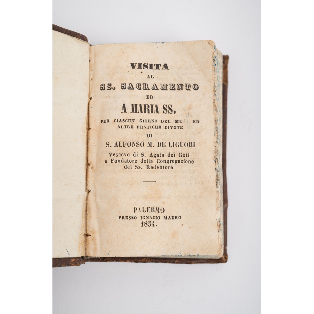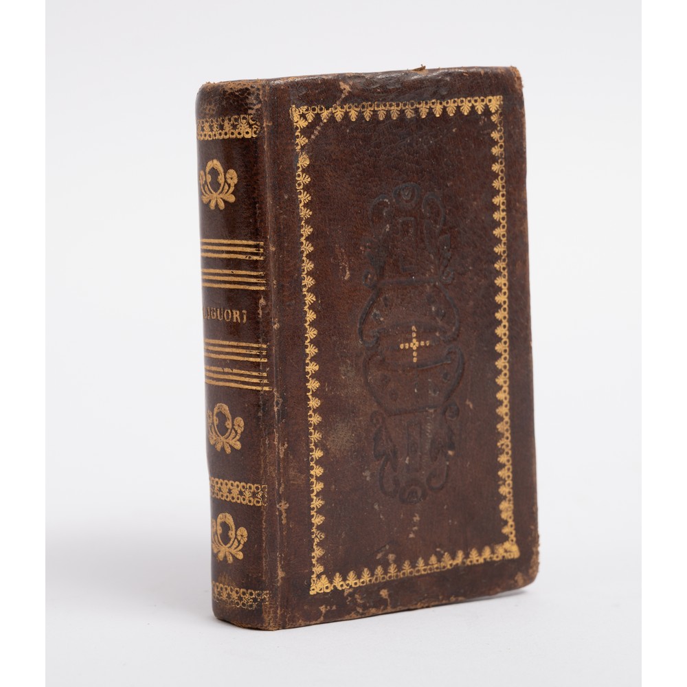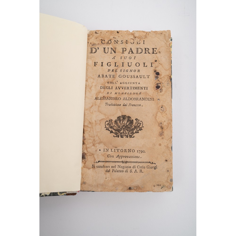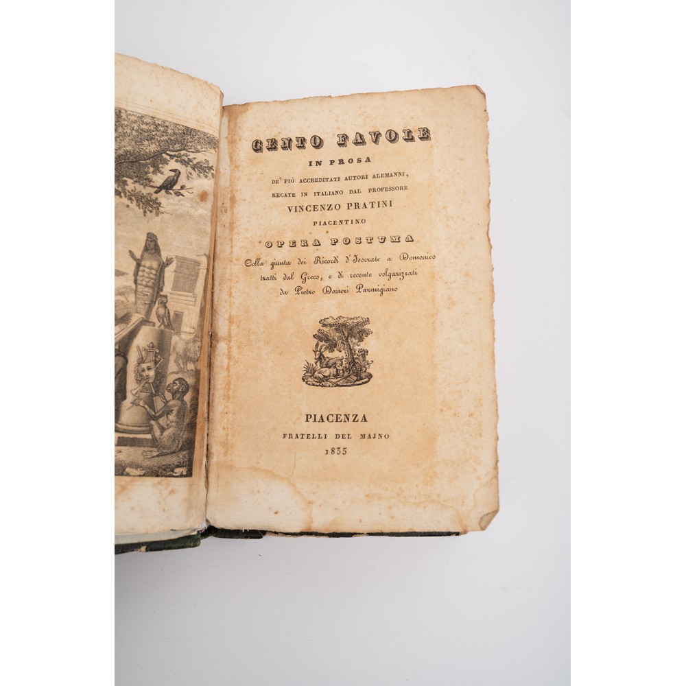 QUATTRO VOLUMETTI DI VARIA IN 16°: 1) Vincenzo Pratini CENTO FAVOLE IN PROSA DE’ PIU’ ACCREDITATI AUTORI ALEMANNI, ed. Piacenza, Fratelli del Majno 1835. Rilegatura in mezza pelle con piatti rigidi cartonati. Titoli al tassello. Usure ai piatti. Incisione in antiporta. Pp. (4), 165 (6).2) Abate Goussault CONSIGLI D'UN PADRE A' SUOI FIGLIUOLI O SIA SCELTA DI MASSIME PER SAVIAMENTE DIRIGERSI NEL MONDO. DEL SIGOR ABATE GOUSSAULT. COLL'AGGIUNTA DEGLI AVVERTIMENTI DI MONSIGNOR ALESSANDRO ALDOBRANDINI , ed. Livorno 1790. Rilegatura in mezza pelle e piatti marmorizzati. Fregi in oro al dorso. Pagine brunite dal tempo, qualche macchia e fioriture. Pp. VIII, 171.3) POESIE DI GIOVANNI FANTONI TOSCANO, ed. Pisa, Niccolò Capurro MDCCCXIX. Legatura in mezza pelle con angoli e piatti marmorizzati. Sporadiche macchie e fioriture. Pp. (3), 112. 4) S. Alfonso Maria De’ Liguori VISITA AL SS. SACRAMENTO ED A MARIA SS., ed. Palermo, Ignazio Mauro 1854. Legatura in piena pelle con crocifisso in oro entro cornice in oro al piatto, titoli e fregi in oro al dorso. Tagli spruzzati. Sporadiche e leggere bruniture del tempo. Pp. 286 (1).