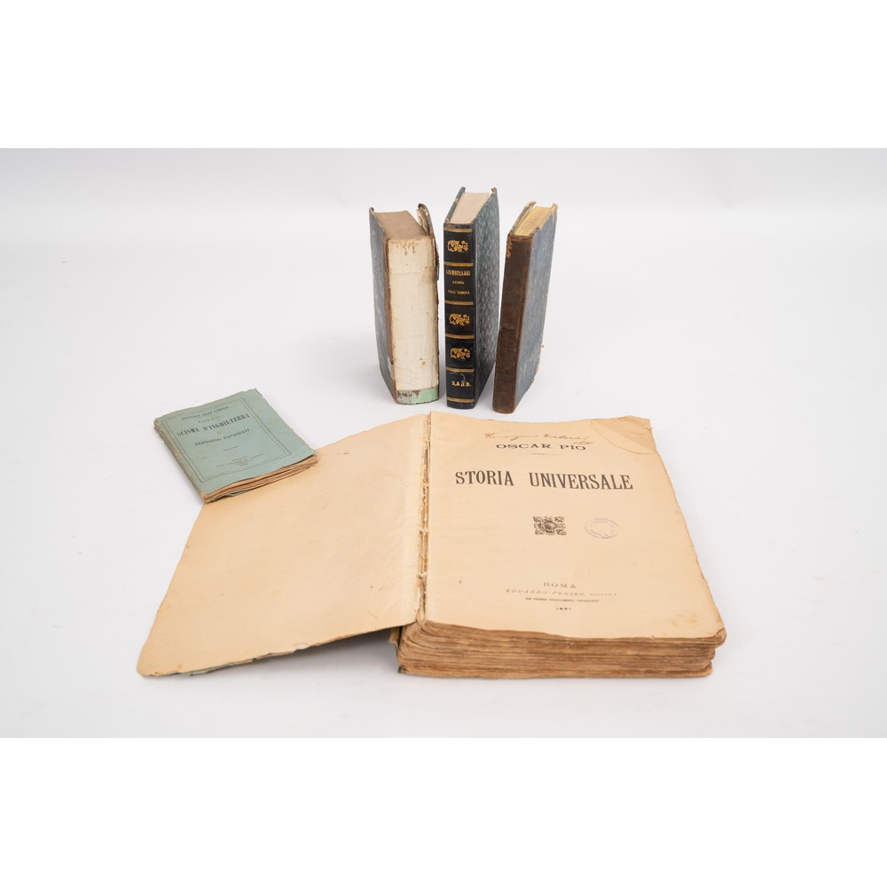 CINQUE VOLUMI DI STORIA DEL XIX SECOLO: 1) F. Francesco Villardi COMPENDIO DELLA STORIA ROMANA DEL DOTT. GOLDSMITH, ed. Napoli a spese di Gennaro Cimmaruta, 1854. Due volumi in unico vol. . In 16°. Rilegatura coeva muta in mezza pelle con piatti cartonati. Note m. s. ai retropiatti e alle sguardie. Bruniture del tempo alle pagine. Pp. 156; 195. 2) Davide Bertolotti STORIA DI SPAGNA DAI PRIMI TEMPI SINO ALL’AVVENIMENTO DI FERDINANDO VII AL TRONO. OPERA SPAGNOLA DEL SIGNOR ASCARGOTA, ed. Napoli Stamperia della Pietà de’ Turchini, 1833. Quattro volumi ed una appendice in unico vol. . In 16°. Rilegatura coeva in mezza pelle con titoli in oro al dorso e piatti cartonati. Dorso staccato ma presente. Fioriture sparse e alcune gore alle ultime pagine. Pp. 238; 236; 192; 148; 308. 3) Gabriele Di Stefano STORIA DELL’EUROPA DI PIERFRANCESCO GIAMBULLARI, ed. Napoli, Gabriele Rondinella Editore 1862. Due volumi in unico vol. . In 16°. Rilegatura successiva in mezza pelle con titoli e fregi in oro al dorso. Piatti cartonati. Pp. 249; 220. 4) Bernardo Davanzati DELLO SCISMA D’INGHILTERRA, ed. Guigoni 1874. In 16°. Brossura editoriale. Piccola manca alla copertina posteriore. Tagli irregolari. Collana Biblioteca delle Famiglie. Leggera brunitura del tempo alle pagine. Pagine ancora intonse. Pp. 125. 5) Oscar Pio STORIA UNIVERSALE, ed. Edoardo Perino, Roma 1891. In 4°. Brossura editoriale mendata con una piccola manca all’angolo alto ed una manca al dorso. Pagine brunite dal tempo. Tagli irregolari. Pp. 800.