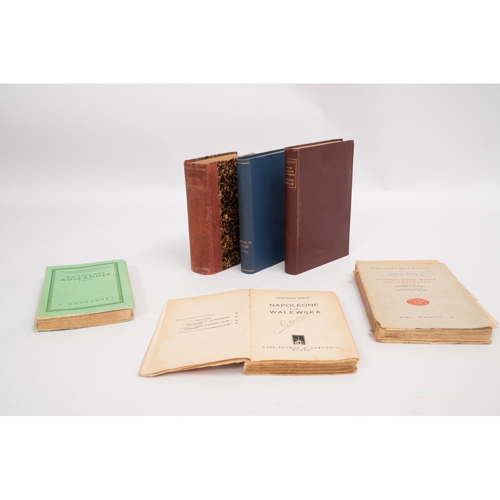 SEI VOLUMI DI STORIA DEL XX SECOLO: 1) Paolo Bulygin LA FINE DEI ROMANOFF (1918), ed. A. Mondadori 1935. Con una nota introduttiva di Alessandro Kerenski. In 8°. Volume della Collana I Libri Verdi. Brossura editoriale marginosa. Tagli irregolari. Pp. 270.2) Eduardo Aunòs SCOPERTA DELLA SPAGNA CONTEMPORANEA, ed. Principato, Roma MDMXXXXII. In 8°. Introduzione di Francesco Spinedi. Brossura editoriale. Tagli irregolari. Collana Biblioteca dell’ I. C. N. F. Pp. XXXII, 288 (1). 3) Gertrude Aretz NAPOLEONE E LA WALEWSKA, ed. Corticelli, 1937. In 8° piccolo. Brossura editoriale figurata a colori. Titoli anche al dorso. Tagli irregolari. Pp. 214 con alcune riproduzioni fotografiche dei ritratti dei personaggi dell’epoca. Fotografia del ritratto della Walewska all’antiporta. 4) B. H. Liddell Hart SCIPIONE AFRICANO, ed. Felice Le Monnier 1929. Con prefazione di Enrico Corradini. In 8°. Legatura editoriale in percallina cerata. Titoli in oro al tassello al dorso. Pp. 277 (4) e 7 tavole delle battaglie f. t. 5) E. Trubetzkoj I RUSSI SU LA RUSSIA, ed. Fratelli Treves 1906. In 8° piccolo. Rilegatura coeva in mezza tela con piatti marmorizzati e titoli in oro al dorso. Pp. VII, 764.6) Agostino Savelli BREVE STORIA DI SPAGNA DALLE INVASIONI BARBARICHE AI GIORNI NOSTRI, ed. Premiata Casa Editrice di Paolo Carrara s. d. ( primi del ‘900) Collana Biblioteca Storica Universale). In 16°. Legatura in tela azzurra cerata con titoli in oro al dorso. Tagli spruzzati. Leggerissime bruniture del tempo ai tagli. Pp. 345 (7).