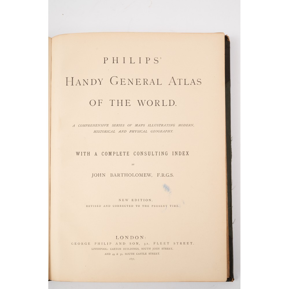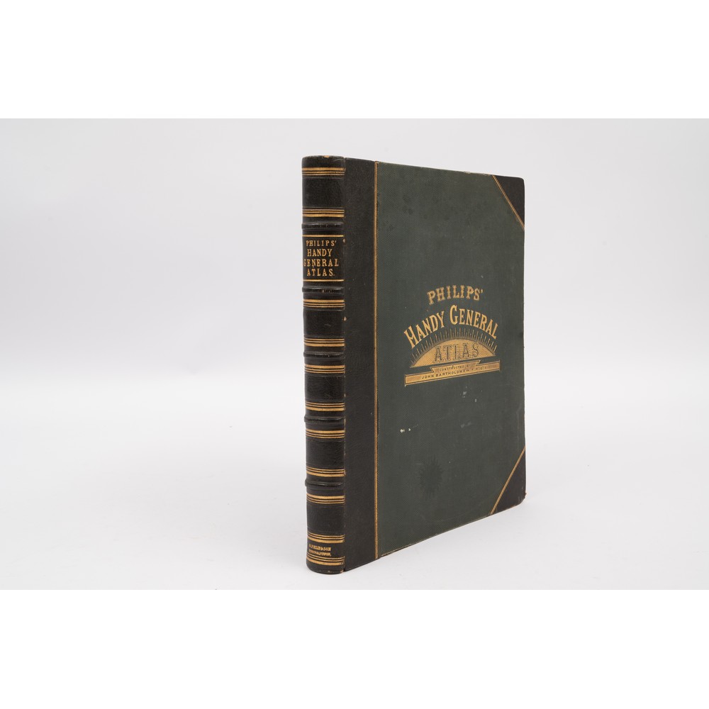 John Bartholomew PHILIPS HANDY GENERAL ATLAS OF THE WORLD, ed. London, George Philip and Son 1876. In folio. Bella legatura editoriale in mezza pelle con angoli e piatti telati, titolo impresso a fuoco in oro. Nervature, titoli e filetti in oro al dorso. Tagli dorati. Con una serie ragionata di mappe storiche e fisiche. Pp. 232. Mappe a colori a doppia pagina.