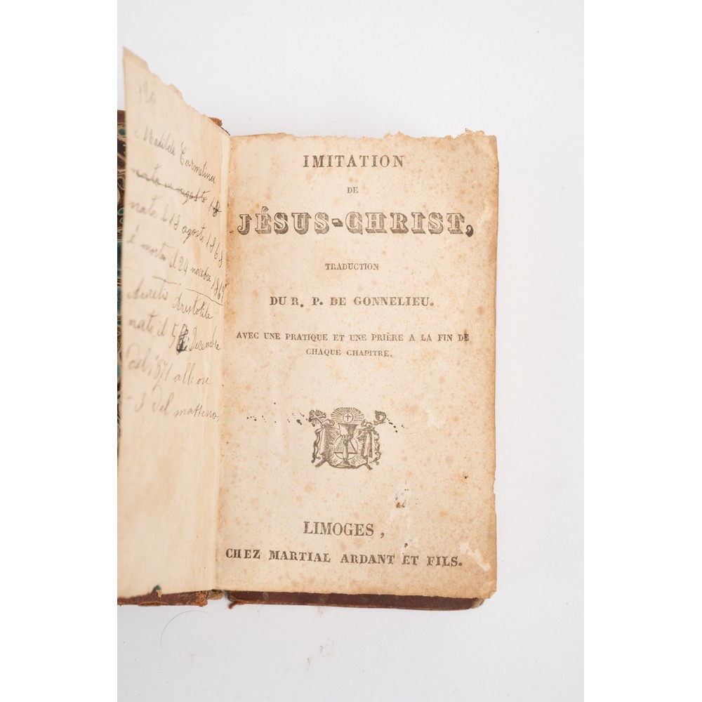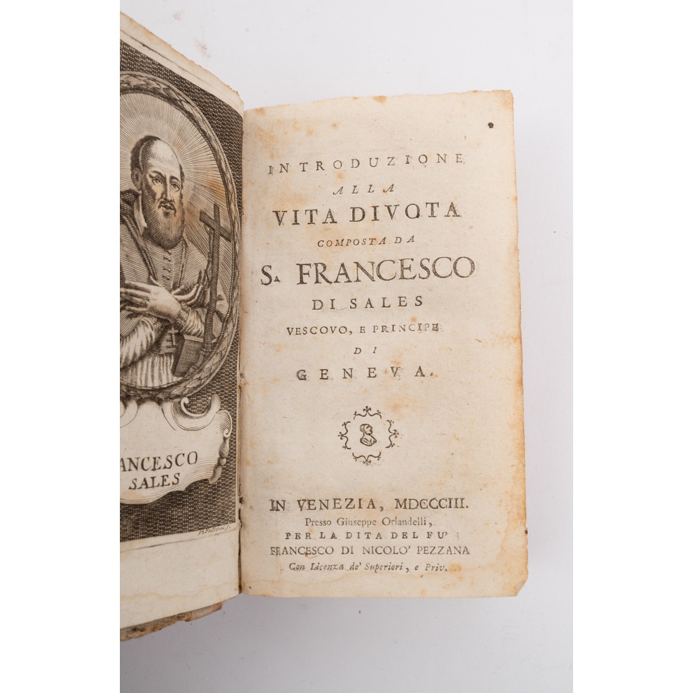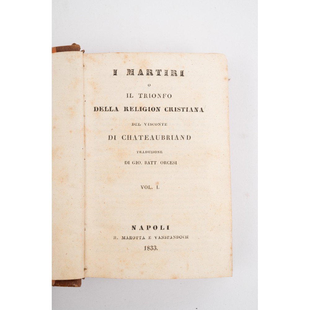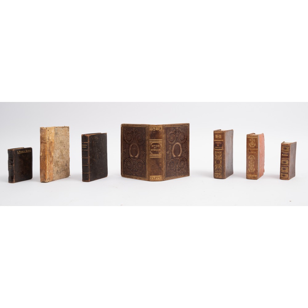 SETTE VOLUMETTI DI RELIGIONE E DI ARGOMENTO RELIGIOSO DEL XIX SECOLO: 1) JOURNEE DU CHRETIEN, ed. Marius Olive, Marseille s. d. (ma 1840). In 16°. Legatura in piena pelle con titoli e fregi in oro al dorso. Pp. 708. 2) P. De Gonnelieu IMITATION DE JESUS CHRIST, ed. Limoges Martial Ardant et Fils s. d. (ma 1867-1868). In 24°. Legatura in piena pelle con titoli e fregi in oro al dorso. Tagli dorati. Pp. 530.3) D. Antonio Benetti IL PICCOLO DIVOTO, ed. Milano, G. Mauri 1884. In 24°. Legatura in piena pelle con titoli e fregi in oro al piatto e al dorso. Pp. 335. 4) Visconte di Chateaubriand I MARTIRI O IL TRIONFO DELLA RELIGION CRISTIANA, ed. Napoli, Marotta e Vanspandoch 1833. In 24°. Rilegatura rigida muta in mezza pelle con piatti marmorizzati. Tre tomi in unico volume. 5) FORMULAIRE DE PRIERES, ed. Tournay, Desclee, Lefebvre et Cie, MDCCCLXXXV. In 24°. Legatura in piena pelle con nervature, titoli e fregi in oro al dorso. Tagli dorati. Testo stampato entro cornice colorata. Incisione del Cristo in gloria all’antiporta. Pp. (4), 536, (6).6) UFFIZIO DELLA SETTIMANA SANTA LATINO E ITALIANO, ed. Nella Stamperia Orsiniana MDCCCXV. In 16°. Legatura in piena pelle con titoli e fregi in oro al dorso e impressioni a secco al piatto del Crocifisso in cornici arabescate. Pp. 678.7) INTRODUZIONE ALLA VITA DIVOTA COMPOSTA DA S. FRANCESCO DI SALES VESCOVO E PRINCIPE DI GENEVA, ed. In Venezia MDCCCIII presso Giuseppe Orlandelli. In 16°. Rilegatura in mezza pergamena e cartonato. Piatti rovinati. Fioriture sparse. Incisione all’antiporta raffigurante il Santo. Pp. 333.