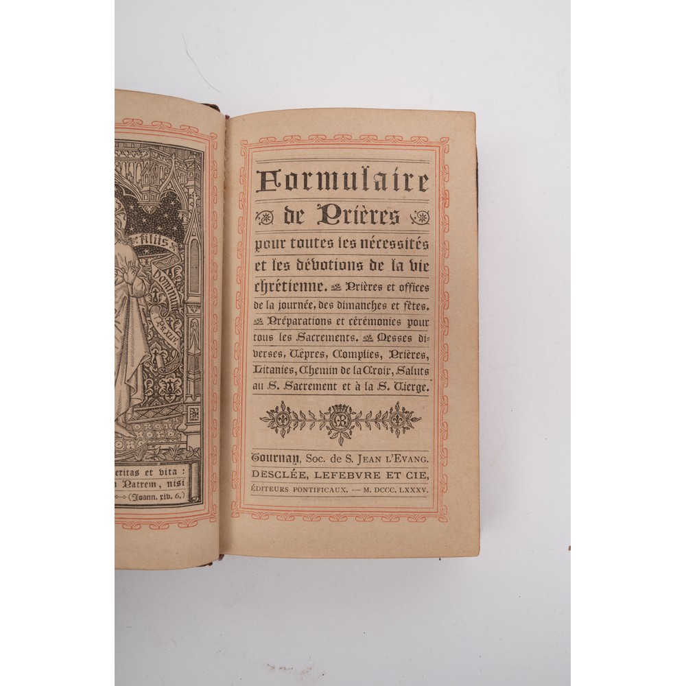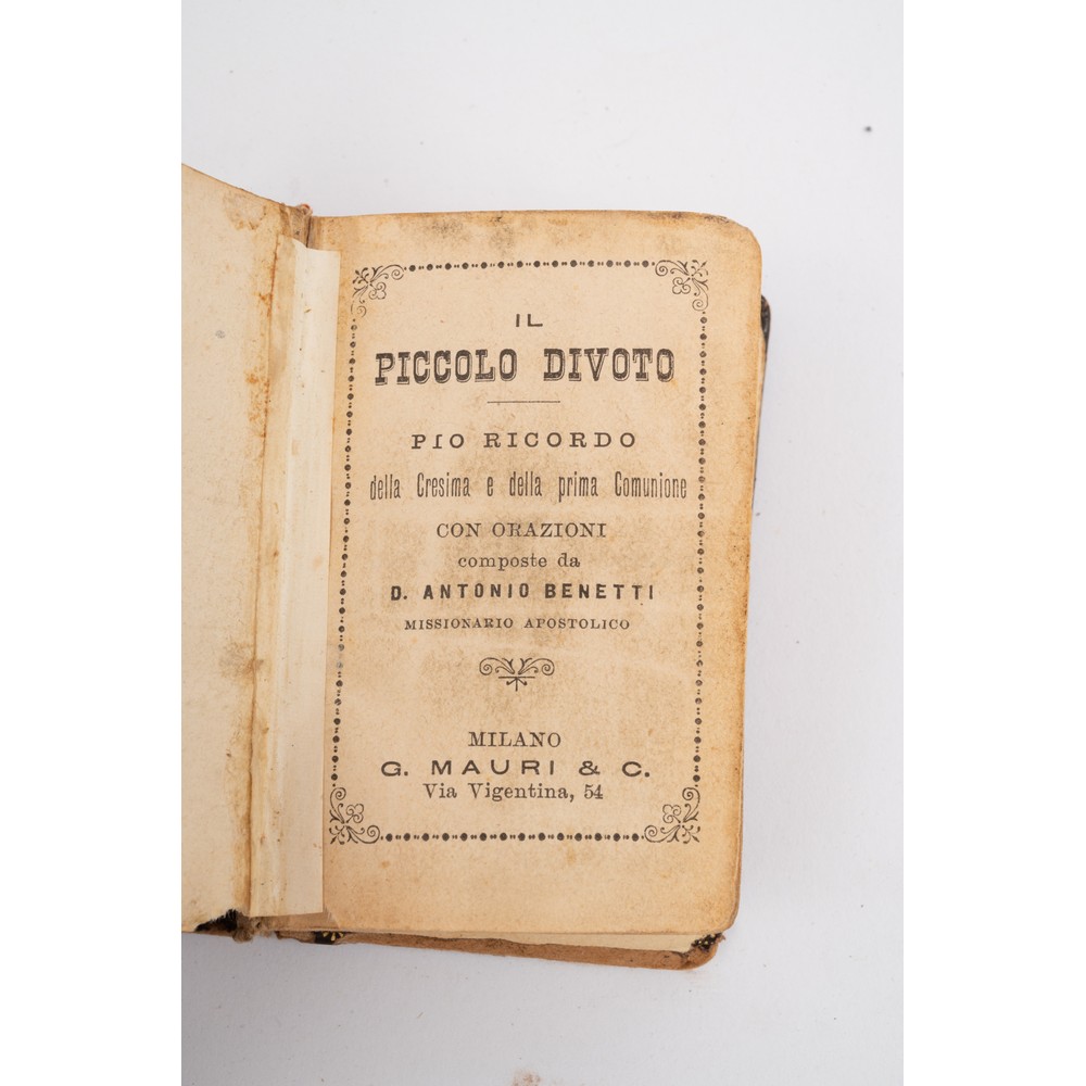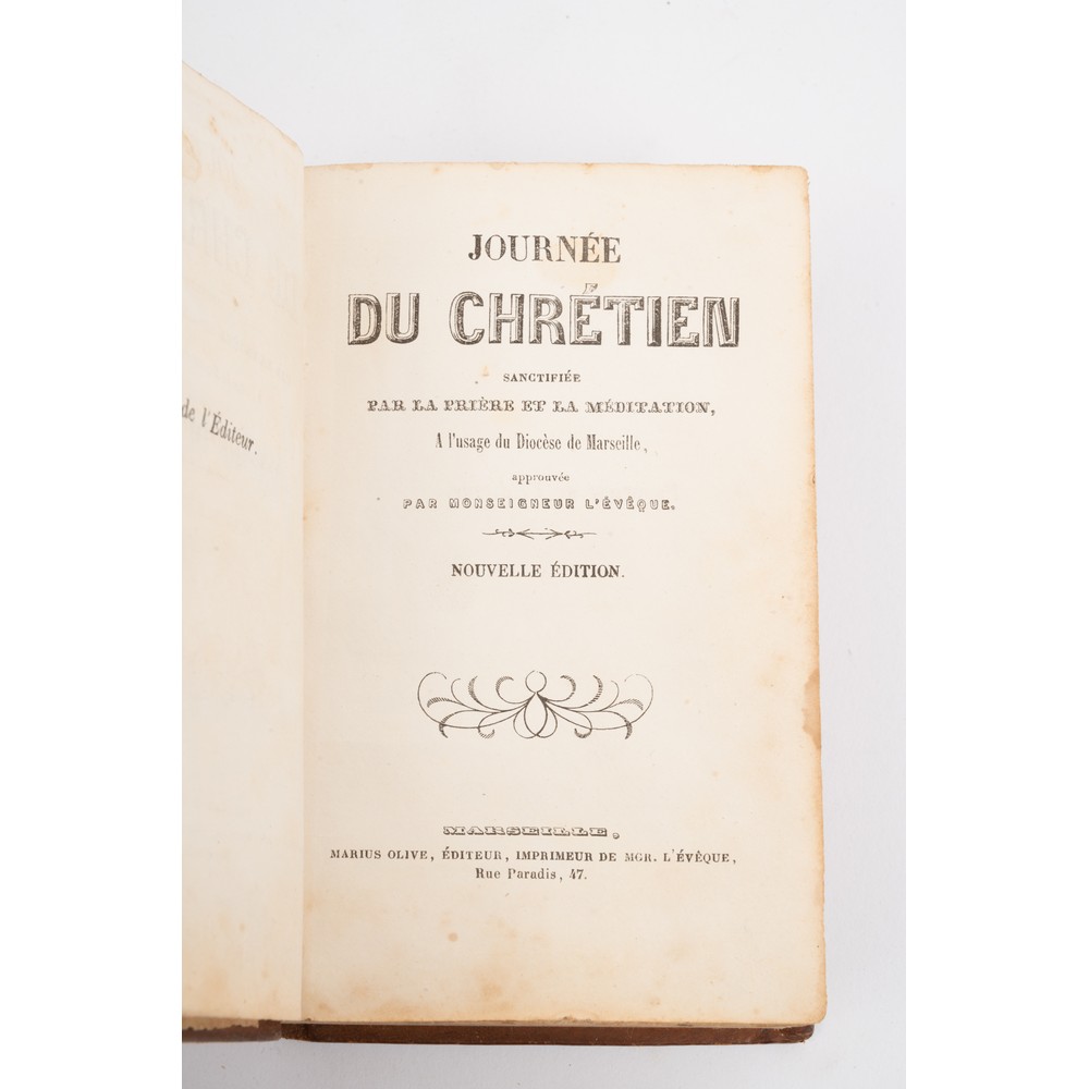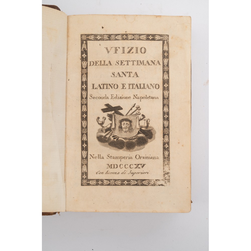 SETTE VOLUMETTI DI RELIGIONE E DI ARGOMENTO RELIGIOSO DEL XIX SECOLO: 1) JOURNEE DU CHRETIEN, ed. Marius Olive, Marseille s. d. (ma 1840). In 16°. Legatura in piena pelle con titoli e fregi in oro al dorso. Pp. 708. 2) P. De Gonnelieu IMITATION DE JESUS CHRIST, ed. Limoges Martial Ardant et Fils s. d. (ma 1867-1868). In 24°. Legatura in piena pelle con titoli e fregi in oro al dorso. Tagli dorati. Pp. 530.3) D. Antonio Benetti IL PICCOLO DIVOTO, ed. Milano, G. Mauri 1884. In 24°. Legatura in piena pelle con titoli e fregi in oro al piatto e al dorso. Pp. 335. 4) Visconte di Chateaubriand I MARTIRI O IL TRIONFO DELLA RELIGION CRISTIANA, ed. Napoli, Marotta e Vanspandoch 1833. In 24°. Rilegatura rigida muta in mezza pelle con piatti marmorizzati. Tre tomi in unico volume. 5) FORMULAIRE DE PRIERES, ed. Tournay, Desclee, Lefebvre et Cie, MDCCCLXXXV. In 24°. Legatura in piena pelle con nervature, titoli e fregi in oro al dorso. Tagli dorati. Testo stampato entro cornice colorata. Incisione del Cristo in gloria all’antiporta. Pp. (4), 536, (6).6) UFFIZIO DELLA SETTIMANA SANTA LATINO E ITALIANO, ed. Nella Stamperia Orsiniana MDCCCXV. In 16°. Legatura in piena pelle con titoli e fregi in oro al dorso e impressioni a secco al piatto del Crocifisso in cornici arabescate. Pp. 678.7) INTRODUZIONE ALLA VITA DIVOTA COMPOSTA DA S. FRANCESCO DI SALES VESCOVO E PRINCIPE DI GENEVA, ed. In Venezia MDCCCIII presso Giuseppe Orlandelli. In 16°. Rilegatura in mezza pergamena e cartonato. Piatti rovinati. Fioriture sparse. Incisione all’antiporta raffigurante il Santo. Pp. 333.