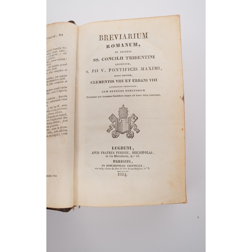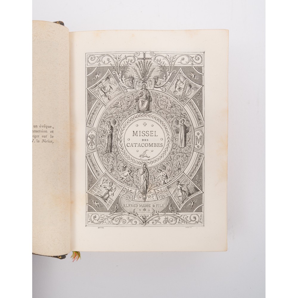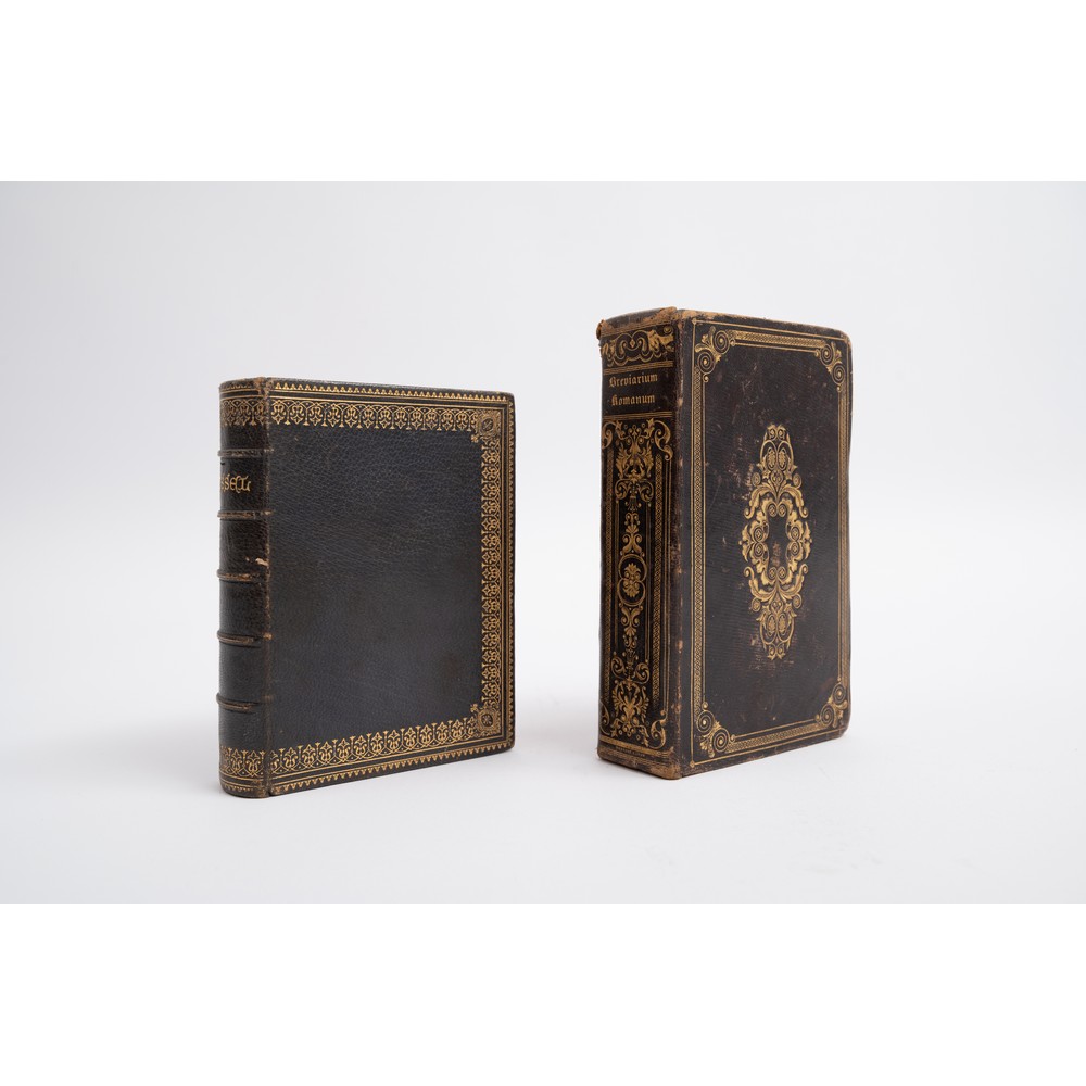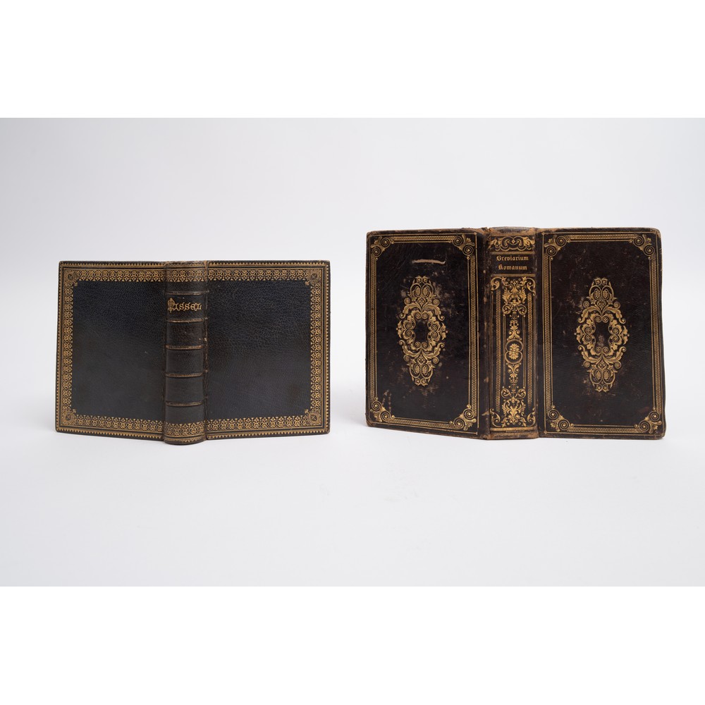DUE VOLUMI DI RELIGIONE DEL XIX SECOLO: 1) BREVIARIUM ROMANUM, ed. Lugduni apud Fratres Perisse, Bibliopolas 1834. In 8°. Bella legatura editoriale in piena pelle con fregio centrale e cornice in oro ai piatti e titoli e fregio monumentale in oro al dorso. Tagli dorati. Pp. 876, 65.2) MISSEL DES CATACOMBES, ed. Tour, Alfred Mame 1892. in 8° piccolo. Bella ed elegante legatura editoriale in piena pelle martellata con decorazione a cornice in oro arabescata su tutta la legatura. Titoli in oro al dorso con nervature filettate in oro. Contropiatti e fogli di guardie in seta azzurra. Testo entro cornice a doppia pagina. Incisione in antiporta. Pagine decorate nello stile manoscritto. Pp. 543.