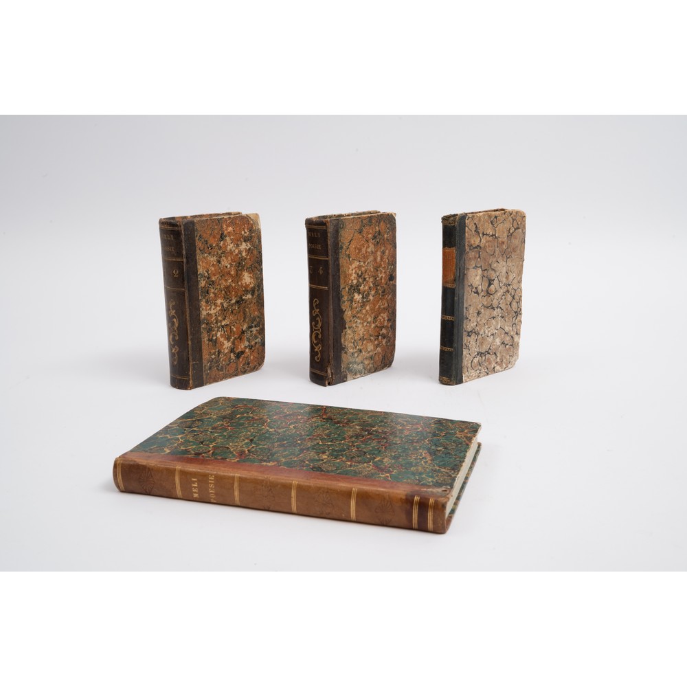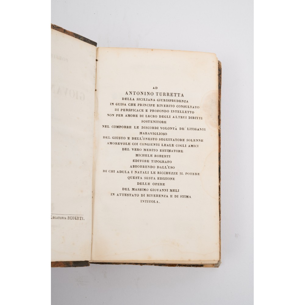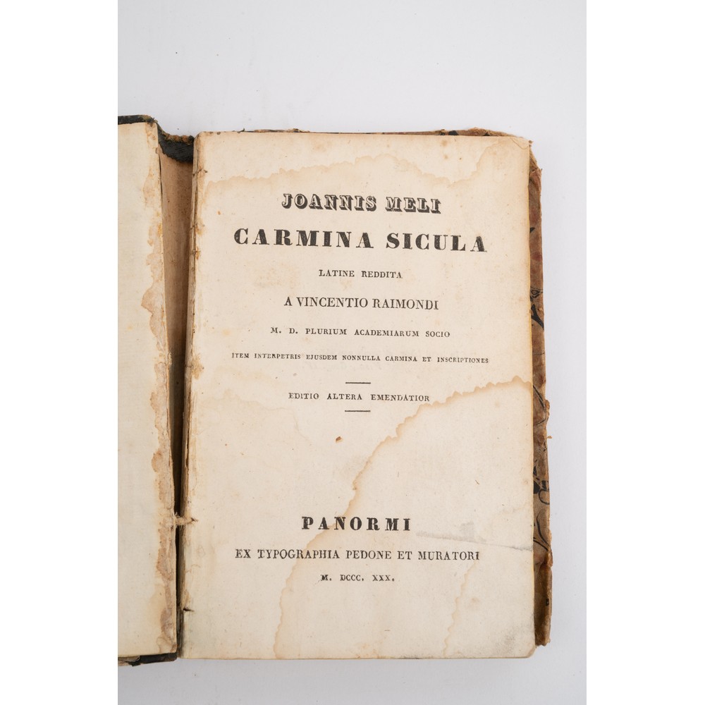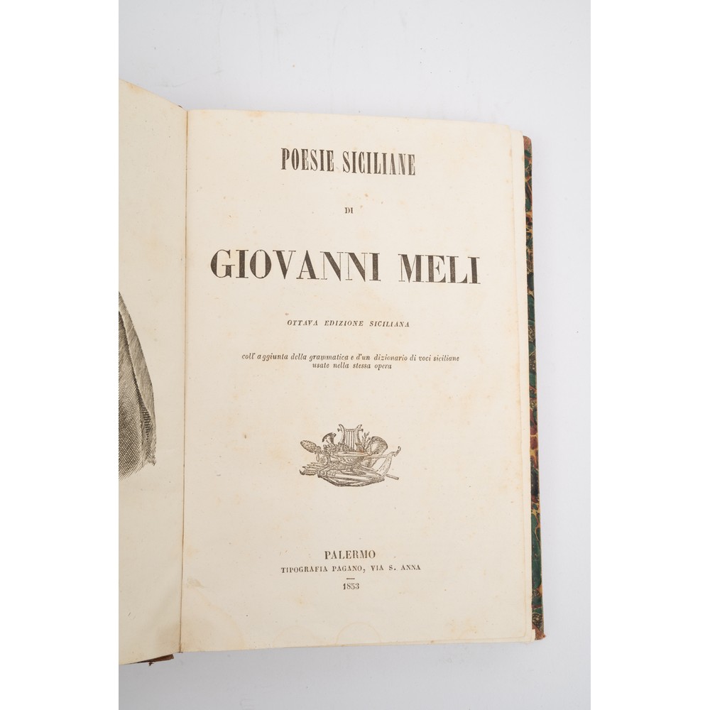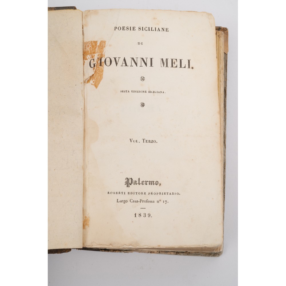 QUATTRO VOLUMI DELL’ABATE GIOVANNI MELI: 1) Joannis Meli CARMINA SICULA, ED. Panormi, Ex Typographia Pedone et Muratori MDCCCXXX. In 16°. Legatura in mezza pelle con piatti marmorizzati e tioli in oro entro tassello al dorso. Fregi in oro al dorso. Gore e fioriture alle pagine. Pp. XIII, 122 (1). 2) POESIE SICILIANE DI GIOVANNI MELI, ed. Palermo, Roberti Editore 1839. Sesta edizione siciliana. Opera dedicata ad Antonino Turretta. 2 volumi in 16°. In antiporta del 1° vol. ritratto inciso dell’Autore. Quattro tomi in due volumi. Legatura in mezza pelle con piatti marmorizzati e tagli spruzzati. Titoli e fregi in oro ai dorsi. Pp. V, 281 (6); 280 (1).3) POESIE SICILIANE DI GIOVANNI MELI, ed. Palermo, Tipografia Pagano 1853. Ottava edizione siciliana. Coll’aggiunta della grammatica e d’un dizionario di voci siciliane usate nella stessa opera. In 8°. In antiporta ritratto inciso dell’Autore. Stampato su due colonne. Legatura in mezza pelle con piatti marmorizzati e tagli spruzzati. Titoli e filetti in oro ai dorsi. Macchie e fioriture alle pagine. Pp. 323, XL.