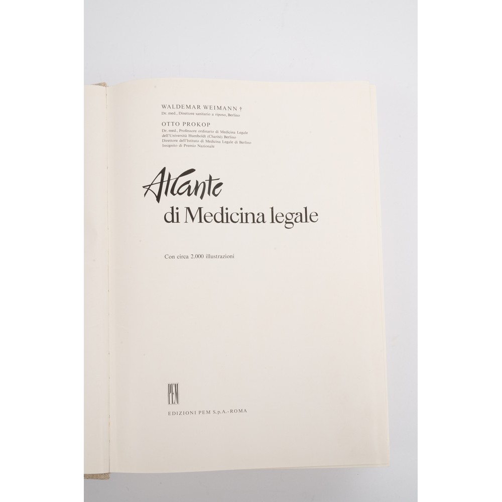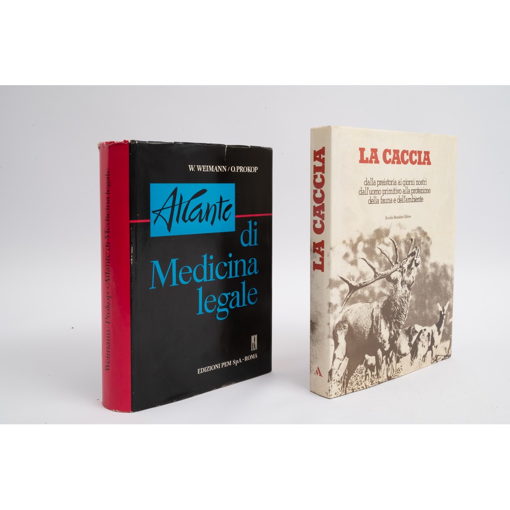 DUE VOLUMI DI VARIA: 1) Waldemar Weimann / Otto Prokop ATLANTE DI MEDICINA LEGALE, ed. PEM, Roma 1966. Cm. 30,5x22,5. Legatura editoriale in tela con sopraccoperta editoriale a colori. L’opera tratta di innumerevoli tipi di crimine di interesse medico. Ricchissima casistica illustrata con circa 2000 foto originali in b/n ad alta risoluzione con scene di delitti, vittime, dettagli di autopsie, ecc. Pp. XIV, 823. 2) Aa. Vv. LA CACCIA DALLA PREISTORIA AI GIORNI NOSTRI, ed. Arnoldo Mondadori Editore 1975. Bella legatura editoriale in tela verde con impressioni a freddo di figure di animali e sopraccoperta editoriale illustrata a colori. Pp. 318 con centinaia di foto di animali nel loro habitat naturale.
