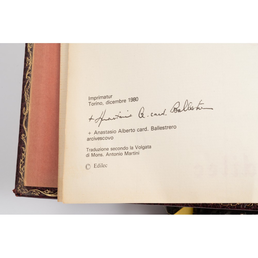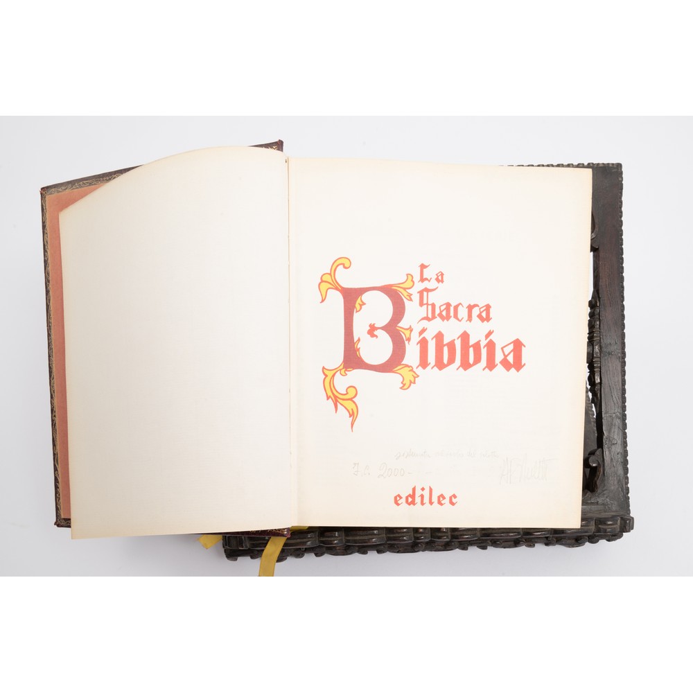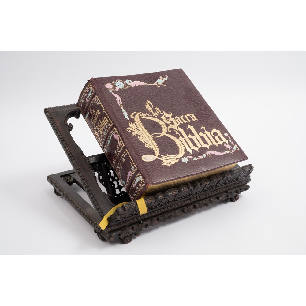 LEGGÌO CON LA SACRA BIBBIA, ed. Edilec, Torino 1980. In 4°. Bella edizione a pagine decorate e tagli in oro. legatura editoriale in similpelle con impressioni dorate del titolo e dei fregi floreali al piatto. Titoli e fregi floreali dorati anche al dorso. Due segnalibro editoriali in stoffa. Pp. (20), 932 con tre tavole a colori f. t. con le mappe della Terrasanta. Bella edizione in perfette condizioni e ancora fresca. Segni di appartenenza m.s. il leggio ligneo novecentesco è in perfette condizioni e riccamente fregiato e decorato con lavori eseguiti a mano. € 80,00. Valutazione € 180,00.