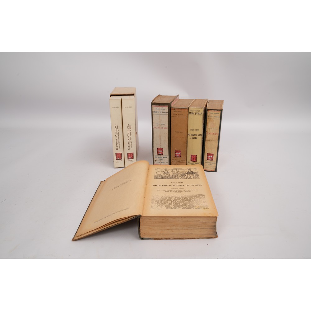 SETTE VOLUMI DI STORIA : 1) Paolo Giudici STORIA D’ITALIA NARRATA AL POPOLO, ed. G. Nerbini, Firenze 1929 – 1933. In 5 volumi. In 8° grande. Rilegature dei fascicoli con brossure. Usure d’uso. Dorso del vol.1 sostituito. Copertine a colori dei fascicoli all’interno. Alcune pagine con fioriture ma in buone condizioni generali di conservazione. Pp. 679 (vol.1); 703 (vol. 2); 767 (vol. 3); 893 (vol. 4); 894 (vol.5). 2) Giuseppe Cipolla LE FAMIGLIE DI VALLELUNGA. GENEALOGIE DALLLE ORIGINI AL 1990, ed. Comune di Vallelunga Pratameno 1995.in 4°. 2 poderosi volumi in brossura conservati in contenitore editoriale in cartone. Edizione a tiratura limitata. Raro a trovarsi. Pp. 845; 715 (4).