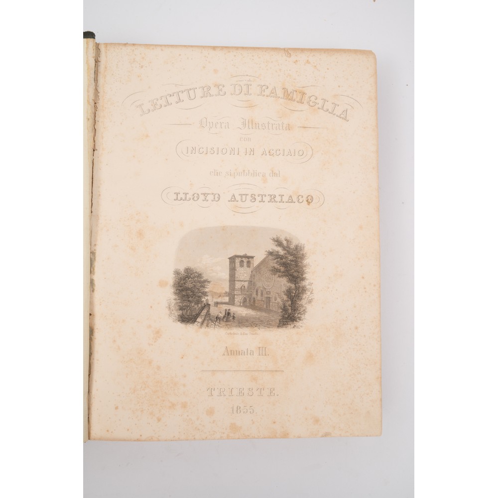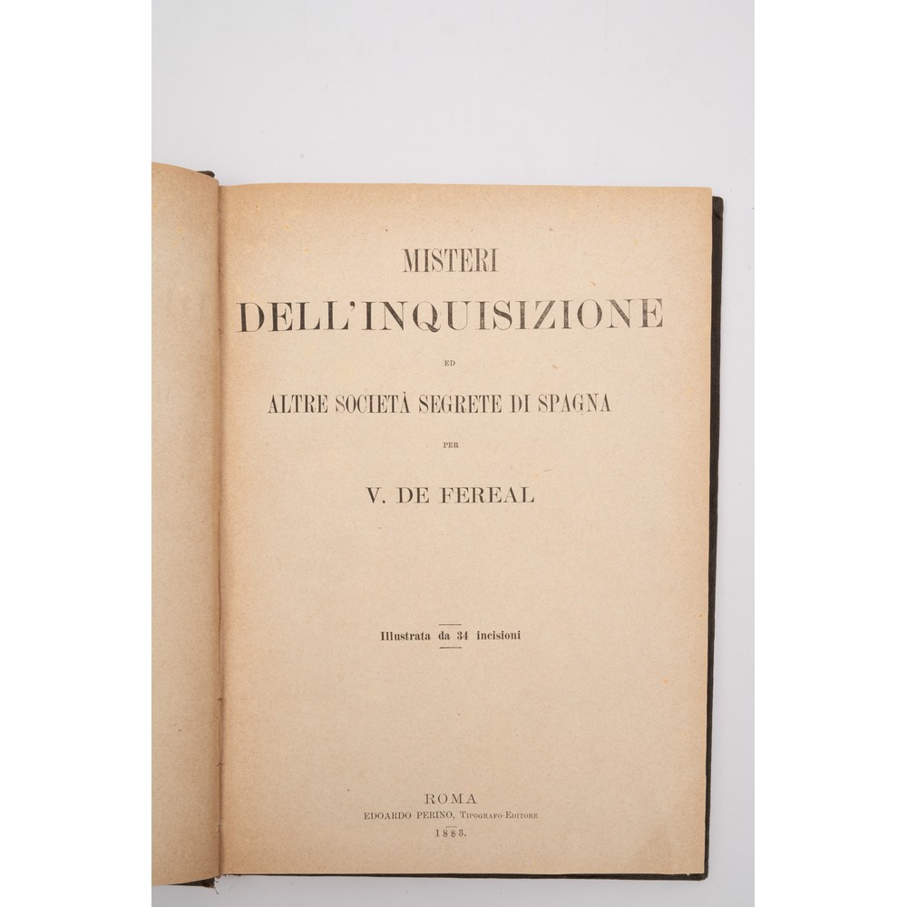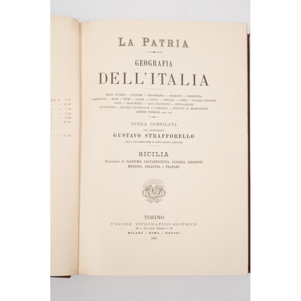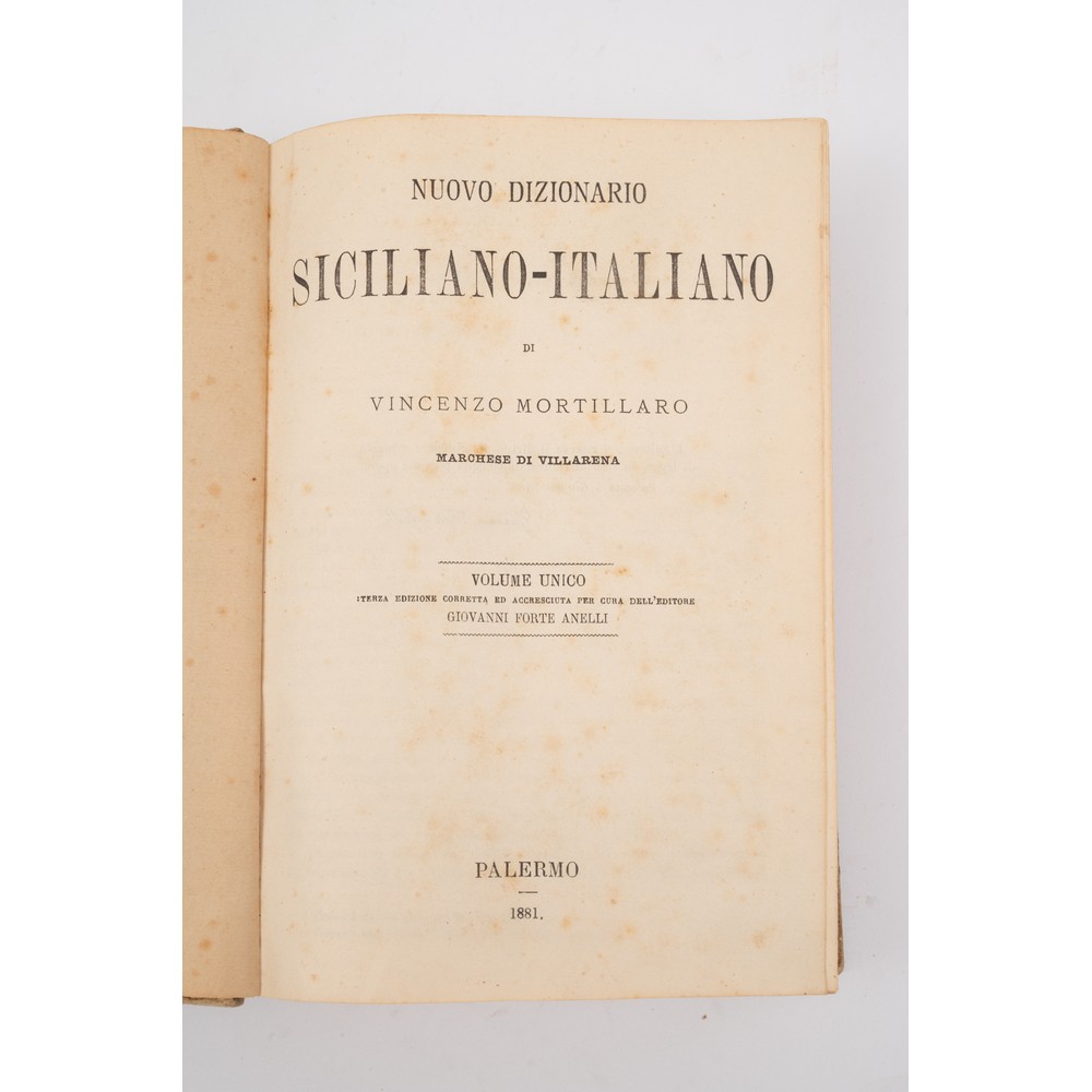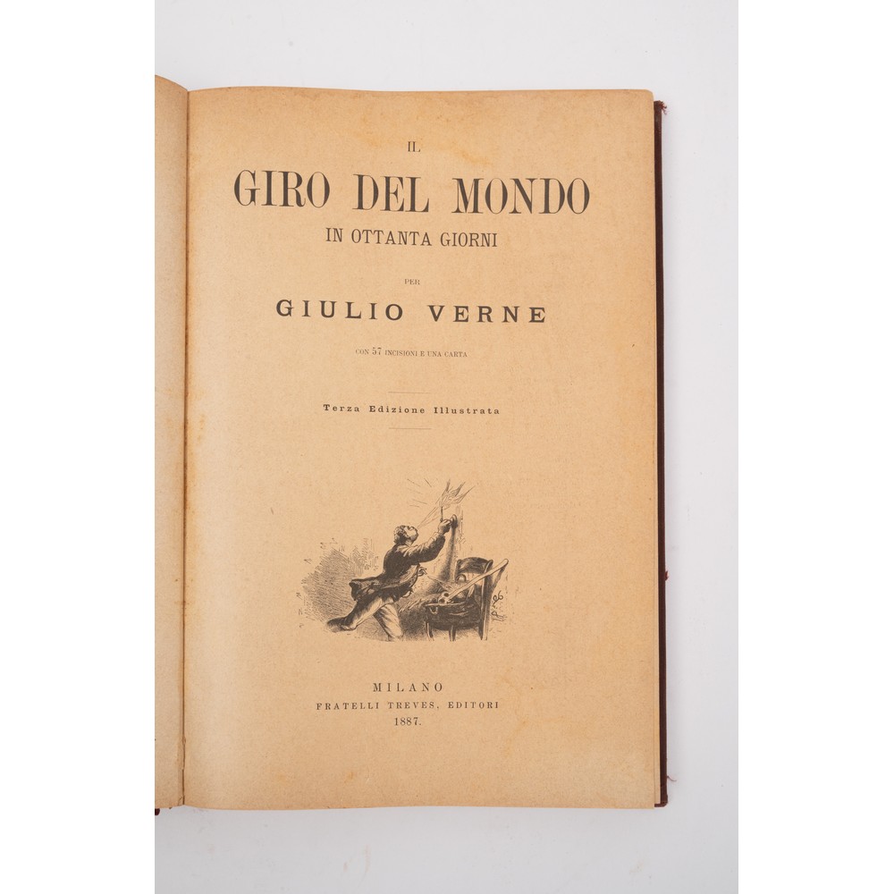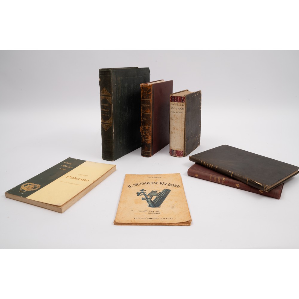 SETTE VOLUMI IN MISCELLANEA: 1) Vito Perroni IL MUSSOLINI DEI BIMBI, ed. Priulla Editore, Palermo Anno VI (1928) dell’era fascista. In 8°. Brossura editoriale figurata. Pp. 99 (3). 2) V. De Fereal MISTERI DELL’INQUISIZIONE ED ALTRE SOCIETA’ SEGRETE DI SPAGNA, ed. Edoardo Perino 1883. In 8° grande. Rilegatura successiva in tela con titoli in oro al dorso. Testo su due colonne. Pp. 267. 3) Giulio Verne IL GIRO DEL MONDO IN OTTANTA GIORNI, ed. Milano Fratelli Treves 1887. In 8° grande. Rilegatura successiva in tela con titoli e fregi in oro al dorso. Con 57 illustrazioni e una carta. Pp. 351. 4) Gustavo Strafforello LA PATRIA GEOGRAFIA DELL’ITALIA. SICILIA, ed. Torino Unione Tipografico – Editrice 1893. In 8° grande. Rilegatura in mezza pelle con piatti rigidi telati e titoli e filetti in oro al dorso. Con illustrazioni e mappe più volte ripiegate f. t. in perfette condizioni. Pp. 684. 5) Vincenzo Mortillaro NUOVO DIZIONARIO SICILIANO – ITALIANO, ed. Palermo 1881. In 8°. Dorso staccato ma presente. Piatti rigidi muti. Pp. 1220.6) Luigi Biagi PALERMO, ed. Bergamo Istituto Italiano d’Arti Grafiche, 1929 -VII. Collana Monografie Illustrate Serie 1^ n. 98. In 8°. Legatura editoriale artistica in cartonato flessibile. Pp. 165.7) LETTURE DI FAMIGLIA, ed. Lloyd Austriaco 1855. Annata III e IV. In 4°. Rilegatura coeva in percallina rigida muta con cornice dorata al piatto e titoli in oro entro cornice artistica in oro al dorso. Pp. 316 (4), 304 (4). € 100,00. Valutazione € 300,00.