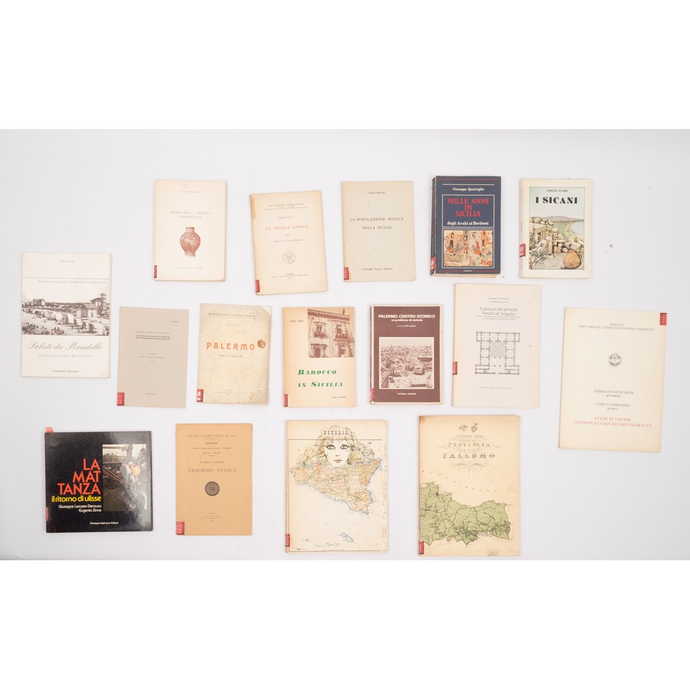 SEDICI OPUSCOLI E PUBBLICAZIONI DI VARIA SULLA SICILIA: 1) Nicolò Pisani BAROCCO IN SICILIA, Isola d'oro 1958, Brossura editoriale flessibile. In ottimo stato. Pp. 99 con tavole in b/n f. t. 2) Gregiorio La Grua – a cura di - LA CORONA DI COSTANZA DI ARAGONA REGINA DI SICILIA, ed. Accademia Nazionale di scienze Lettere e Arti di Palermo, 1988. Premessa di Romualdo Giuffrida. Brossura editoriale. In folio. Pp. 31 con le foto a colori della corona e dei suoi particolari.3) AA. VV. I CENTO ANNI DELLA PROVINCIA DI PALERMO, ed. U. Manfredi, Palermo 1960. In folio. Brossura editoriale. Pp. 120 con un apparato di foto e immagini in b/n n. t. 4) MONOGRAFIA SU BRUNO CARUSO, edita dalla E.S.A. Poligrafico di Palermo, 1974. Cm 32 x 24. Brossura editoriale con usure ai bordi. Edizione speciale pèer il 20° anno di attività del Poligrafico Palermitano. Pp. 120 con una particolare carrellata di opere di Bruno Caruso. 5) Giovanna Brandaleone STORIA DELLA CERAMICA PALERMITANA, ed. E.S.A. Poligrafico, Palermo 1969. Cm 24 x 17. Pp. 111 con 33 tavole in b/n f. t. 6) Francesco Vitrano I SICANI, ed. A. Giannone, Palermo 1984. Cm 24 x 17. Brossura editoriale in cartonato flessibile e sopraccoperta editoriale in carta illustrata. Pp. 140.7) Giulio Beloch LA POPOLAZIONE ANTICA DELLA SICILIA, ed. Arnaldo Forni s. d. ma ristampa anastatica dell’edizione del 1889. In 8°. Brossura editoriale in cartonato flessibile. Pp. 84.8) E. Mauceri PALERMO (NEL PASSATO), ed. Palermo, G. Pedone Lauriel 1906. Collana Monografie Siciliane – II. In 8°. Brossura editoriale in carta similpergamena con usure. Pp. 38. 9) M. Ornella Acanfora PANORMO PUNICA, ed. Giovanni Bardi 1947. Atti della Accademia Nazionale dei Lincei. Anno CCCXLIV – 1947. Memorie, fascicolo 5. Brossura editoriale. Cm 27 x 18,5. Pp. (51).10) Umberto Massocco LA SICILIA ANTICA, ed. Palermo, Presso la Società Siciliana per la Storia Patria 1958. In8°. Estratto dall’Archivio Storico Siciliano Serie III, Vol. VIII. Pp. 46. 11) Giuseppe Quatriglio MILLE ANNI IN SICILIA. DAGLI ARABI AI BORBONI, ed. Ediprint, Palermo 1985. Brossura editoriale illustrata con alette descrittive. Pp. 239 con 70 tavole f. t. 12) Vieri Quilici – a cura di - PALERMO CENTRO STORICO: UNA QUESTIONE DI METODO, ed.Officina Edizioni 1980. Collana Rapporti di ricerca n. 11. Cm 24,5 x 18. Brossura editoriale illustrata. Pp. 123 con tavole f. t. 13) Giuseppe Lazzaro Danzuso / Eugenio Zinna LA MATTANZA. IL RITORNO DI ULISSE, ed. Giuseppe Maimone Editore 1987. Cm 24,5 x 25. Brossura editoriale illustrata con ali. Pp. 105 con un ricco apparato fotografico. 14) Margherita Pirrone / Arturo Oliva TECNICHE COSTRUTTIVE STORICHE DEL PATRIMONIO EDILIZIO EOLIANO, estratto da Archivio Storico Messinese, Messina 1995. Brossura editoriale. Pp. (37). 15) Giuseppe Di Benedetto / Giuseppina Pizzuto IL PALAZZO DEI PRINCIPI NASELLI AD ARAGONA, ed. Istituto Principe di Aragona, 1996. Brossura editoriale figurata con sopraccoperta in carta figurata a specchio. In 4°. Pp. 78. 16) Lelia Collura SALUTI DA MONDELLO. CARTOLINE D’EPOCA DELLA COLLEZIONE NAVARRA, ed. Casa Editrice Panorama, 1996. Cm 30 x 21. Pp. 63.