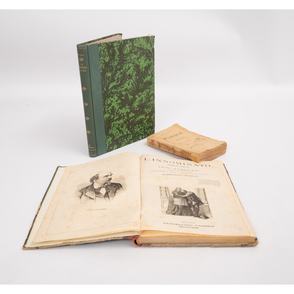 TRE VOLUMI DEL XIX E XX SECOLO: 1) Volume unico che contiene due opere uscite a dispense rilegate in un volume in 4°, in mezza pelle e piatti marmorizzati. Titoli e fregi in oro al dorso: Luigi Gualtieri L'INNOMINATO e DIO E L’UOMO, seguito dell’Innominato, ed., Ferdinando Garbini 1882. All’antiporta dei due romanzi ritratto di Luigi Gualtieri. Macchie e fioriture sparse. Usure ai tagli dei piatti. Nel complesso in ottime condizioni. Stampato su due colonne Pp. 224; 133. 2) Emilio Zola - Ciclo Le Tre Città - PARIGI, ed. Roma Stabilimento Tipografico della “Tribuna”, 1898. In 8°. Brossura editoriale restaurata. Generale leggerissimo imbrunimento del tempo alle pagine, le quali risultano pulite e ben tenute. Nel ciclo delle tre città, l’autore polemizza contro la religione in nome della scienza. Pp. 596. 3) William Galt LA PRINCIPESSA LADRA, ed. Editrice La Gutemberg, Palermo 1930. 1^ edizione a fascicoli. Con le illustrazioni di Luigi Natoli. In 4°. Rilegatura in mezza tela con piatti marmorizzati e titoli e fregi in oro al dorso. La rilegatura contiene le brossure originali cartonate del 1930. Ex libris di Camillo Orlando. Pp. 400.