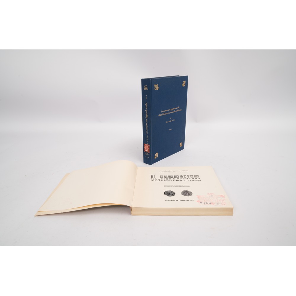 DUE VOLUMI DI NUMISMATICA ISLAMICA E NORMANNA: 1) Francesco Sapio Vitrano IL NUMMARIUM ISLAMICO E NORMANNO DELLA BIBLIOTECA COMUNALE DI PALERMO, ed. Municipio di Palermo 1975. Introduzione di Antonino Manfré. Fotografie di Salvatore Sparacino. Cm 23 x 25. Brossura editoriale cartonata flessibile illustrata. In ottime condizioni. Pp. 346 con 285 immagini di monete n. t. e 26 pagine di tavole f. t. 2) Maria Amalia De Luca LE MONETE CON LEGENDA ARABA DELLA BIBLIOTECA COMUNALE DI PALERMO, ed. Palermo 1998. Parte I. Cm 30,5 x 22. Legatura editoriale in tela azzurra con fregi e titoli in oro al piatto e al dorso. Collana Aere perennius. Cataloghi, 1. In testa al frontespizio: Città di Palermo, Assessorato alla cultura, Biblioteca comunale. La parte I fu l'unica pubblicata. Opera di rilevante interesse scientifico. Opera in perfette condizioni. Rarissimo. Pp. XXXIX, 399.