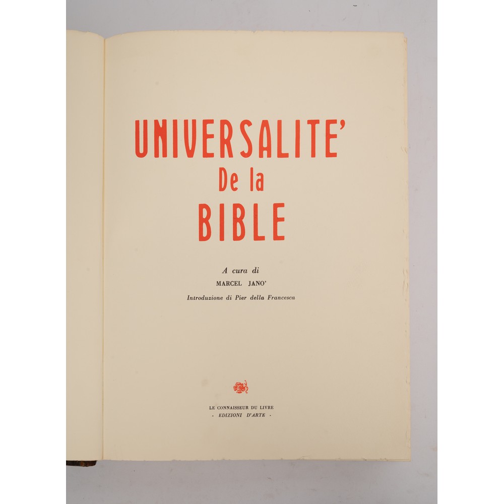 Marcel Jano – a cura di - UNIVERSALITE’ DE LA BIBLE, ed. Le Connaisseur du Livre – Edizioni D’Arte, Milano 1969.introduzione di Pier della Francesca. In folio. Stampato su carta camoscio appositamente realizzata dalla cartiera Ventura di Cernobbio e su carta bronzo raso appositamente realizzata dalla cartiera I.C.A.P. di Milano. Incisioni su lastre di zinco raffigurante il Mosè di A Hoffmann, eseguito dallo scultore Carlo Sessa. Lavori a sbalzo dei piatti in lastra di bronzo di Dante De Felici. Ex libris in argento 800 curato dalla gioielleria Scavia di Milano. Esemplare n. 1732 di 2000 esemplari. Pp. 234 con le tavole n. t. e tre tavole ripiegate f. t.