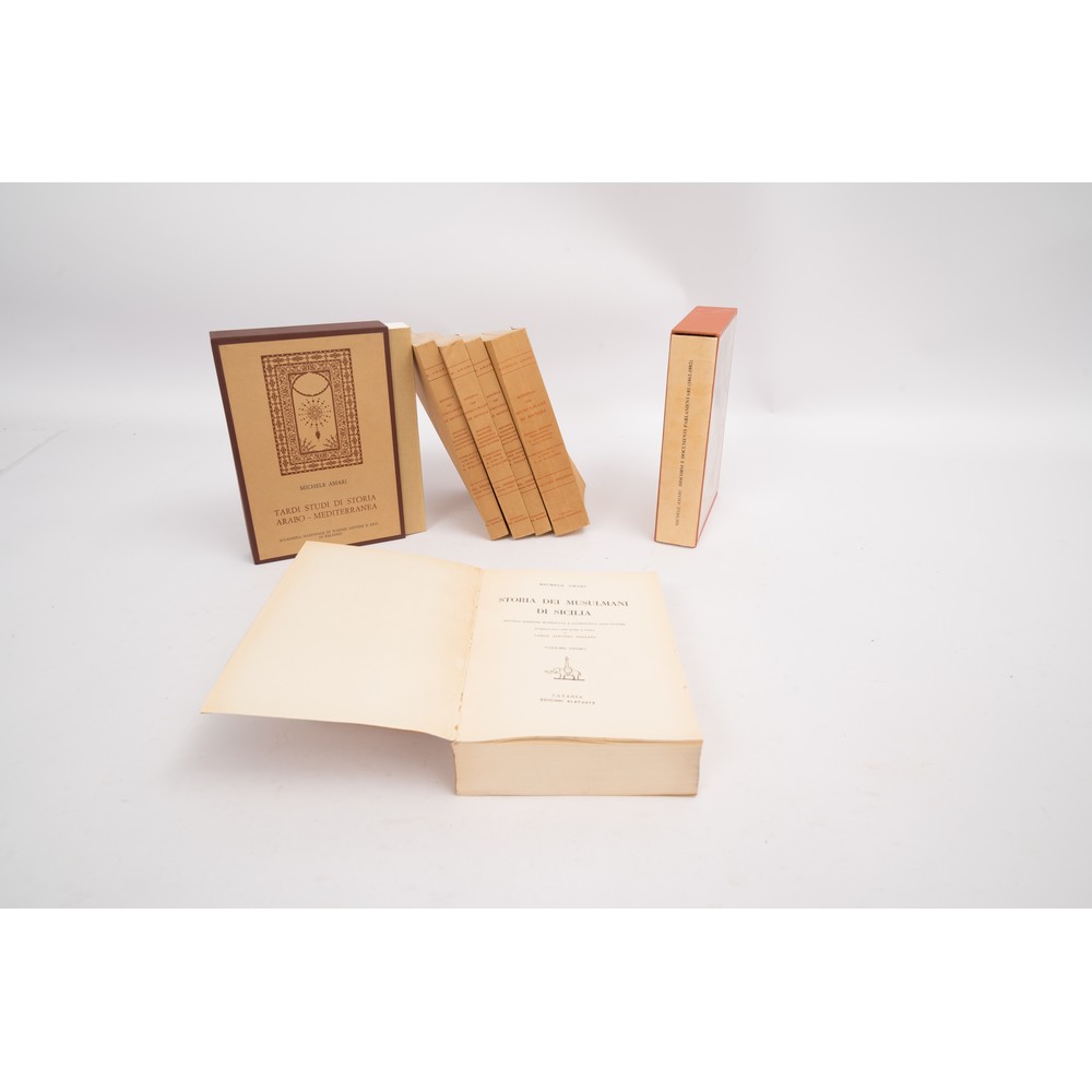 SETTE VOLUMI DI MICHELE AMARI: 1) STORIA DEI MUSULMANI DI SICILIA, ed. Catania, Elefante 1933. 5 volumi in 8° (cm. 24,5 x 18). Brossura editoriale. Volumi come nuovi. Opera in tre parti suddivisa in 5 volumi; seconda edizione modificata e accresciuta dall'autore, pubblicata con note a cura di Carlo Alfonso Nallino: volume primo - vol. secondo - vol. terzo (parte prima) - vol. terzo (parte seconda) e vol. terzo (parte terza). Pp. XLIII, 677; XIX, 630; 350; 351-670; XI, 671-1038.2) TARDI STUDI DI STORIA ARABO MEDITERRANEA, ed. Accademia Nazionale di Scienze Lettere e Arti di Palermo, 1985. In brossura editoriale. Volume contenuto in cofanetto editoriale figurato. Come nuovo. Pp. 541, (2). 3) DISCORSI E DOCUMENTI PARLAMENTARI (1862 – 1882)1989, ed. Accademia Nazionale di Scienze Lettere e Arti di Palermo, 1985. In brossura editoriale. Volume contenuto in cofanetto editoriale illustrato. Stampato su carta patinata. Come nuovo. Pp. XLII, (4), 891.
