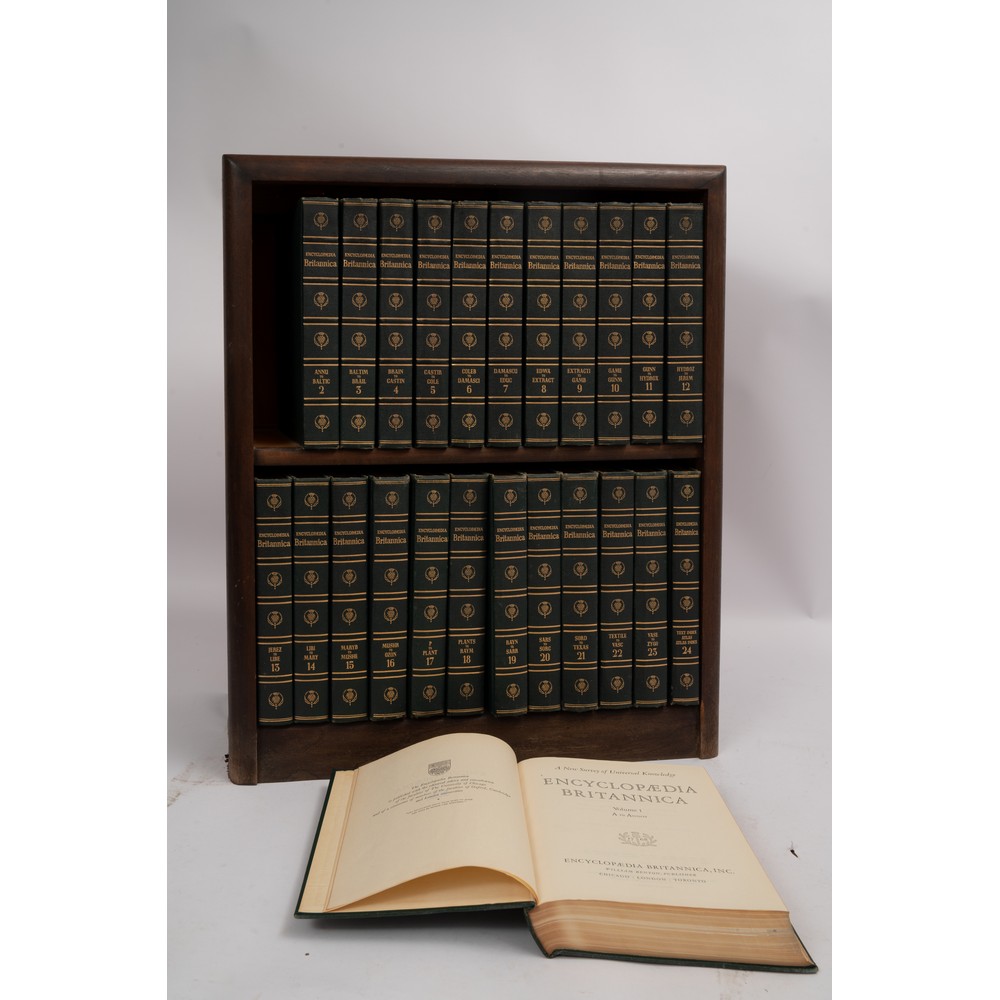 VENTIQUATTRO VOLUMI: AA. VV. ENCYCLOPEDIA BRITANNICA, ed. William Benton, 1960. In 24 volumi. Legature editoriali in tela rigida verde con stemma in oro impresso ai piatti e titoli e fregi in oro ai dorsi. Testo su due colonne. Migliaia di voci e di pagine. Con centinaia di immagini in b/n n. t. e f. t. leggere ingialliture del tempo ma opera nel complesso in perfette condizioni. L’enciclopedia è contenuta in piccola libreria lignea.