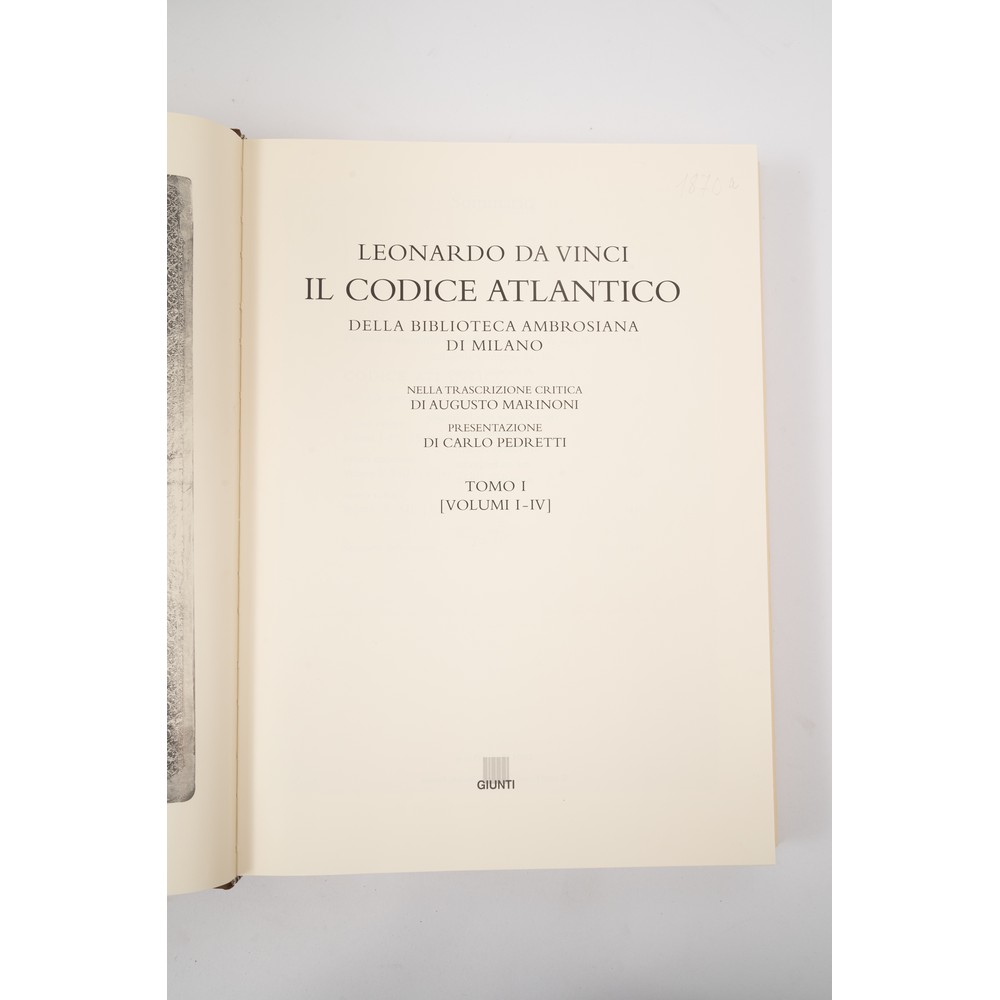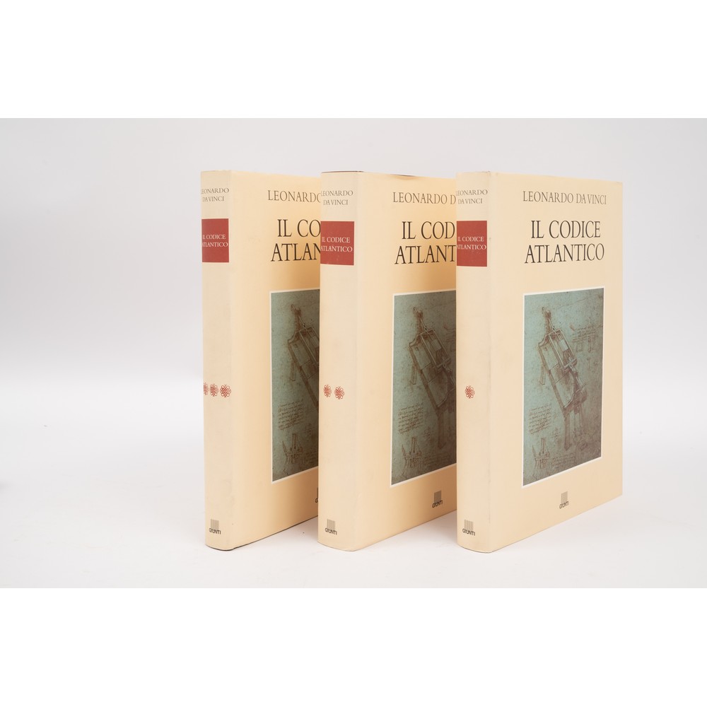 TRE VOLUMI IN COFANETTO : Leonardo Da Vinci IL CODICE ATLANTICO, ed. Giunti, 2000. A cura di A. Marinoni. In 3 volumi in cofanetto editoriale muto. In 4°. Legature editoriali in tela rigida con titoli entro cornice dorata ai piatti. Sopraccoperte editoriali in carta con illustrazioni. Il Codice Atlantico è un'ampia raccolta dei fogli leonardiani. L'opera si sviluppa lungo l'intera produzione di Leonardo, per un lasso temporale di oltre quarant'anni, a partire dal 1478, e presenta una ricca documentazione dei suoi contributi alla scienza meccanica e matematica, all'astronomia, alla geografia fisica, alla botanica, alla chimica e all’ anatomia, disegni di armamenti e di macchine per volare. I volumi presentano inoltre suoi pensieri attraverso alcune favole e scritti apologetici, aspetti teorici e pratici della scultura e della pittura, studi sulla prospettiva e un elenco dei materiali usati. Questo cofanetto è suddiviso in tre tomi: il primo comprende i volumi I-IV, il secondo i volumi V-VIII, il terzo i volumi IX-XII. Pp. X, (1), 2000 continuative.