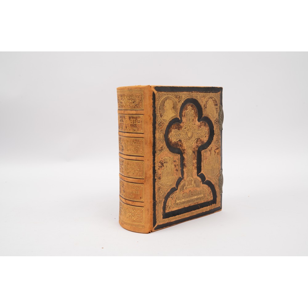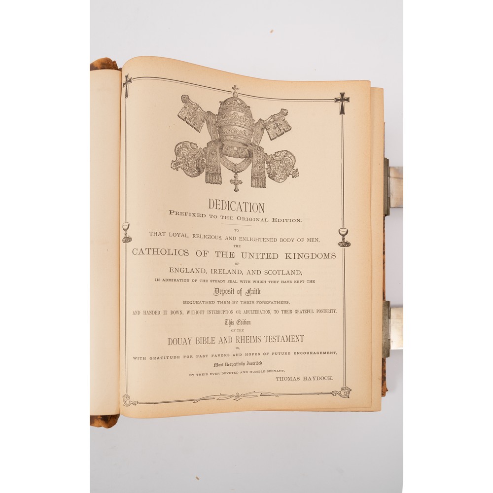 AA. VV. THE HOLY BIBLE CONTAINING THE ENTIRE CANONICAL SCRIPTURES, ACCORDING TO THE DEGREE OF THE COUNCIL OF TRENT, ed. W. L. Richardson, Boston, 1884. In 4°. Bella e poderosa legatura lignea lavorata e foderata di pelle goffrata con elaborata decorazione impressa in oro a freddo su entrambi i piatti. Ganci e fermagli lavorati ai piatti. Tagli dorati. Titoli e decorazioni in oro entro cornice al dorso.