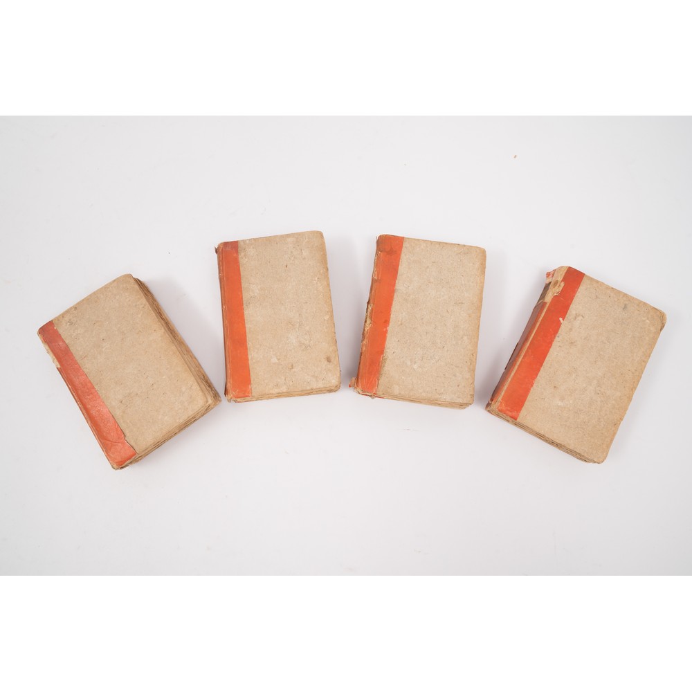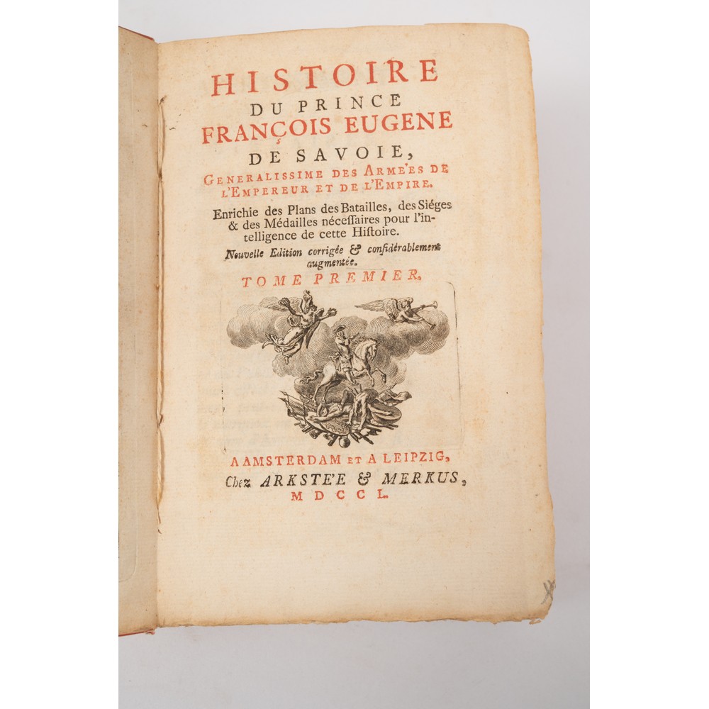 QUATTRO VOLUMI DI Eleazar De Mauvillion: HISTOIRE DU PRINCE FRANÇOIS EUGENE DE SAVOIE, GENERALISSIME DES ARMÉES DE L`EMPEREUER ET DE DE L`EMPIRE, ed. A Amsterdam et A Leipzig Chez Arkstee & Merkus MDCCL. Ritratto inciso all’antiporta del vol. 1. Del Principe Eugenio realizzato dal famoso incisore Johann Bernigeroth. In 16°. Solo 4 dei 5 volumi. Vol. secondo assente. Rilegature in cartonato rustico. Tagli irregolari. Pagine perfettamente conservate e fresche. Testatine e finalini incisi. Frontespizi in bicromia rosso e nero. Pp. 10 nn , 371 (Vol. 1); 380 ( Vol. 3); 430 ( Vol. 4); 392 ( Vol. 5). Le incisioni sono su lastre di rame. Numerose vignette e medaglie incise e iniziali ornamentali.