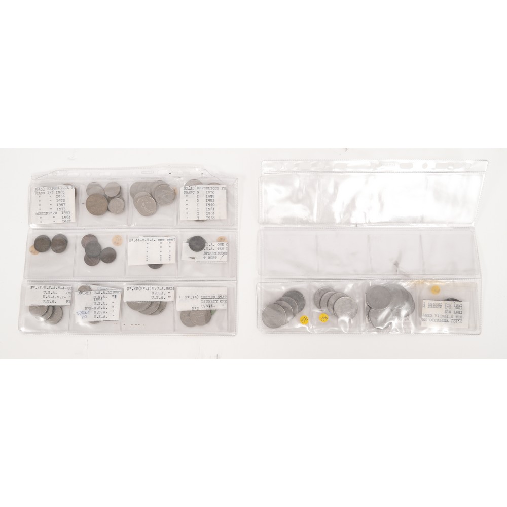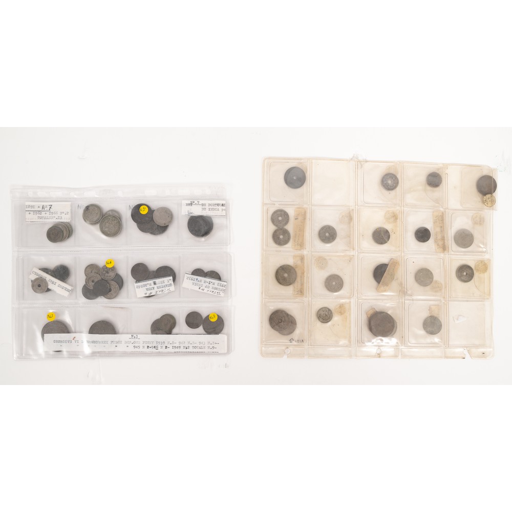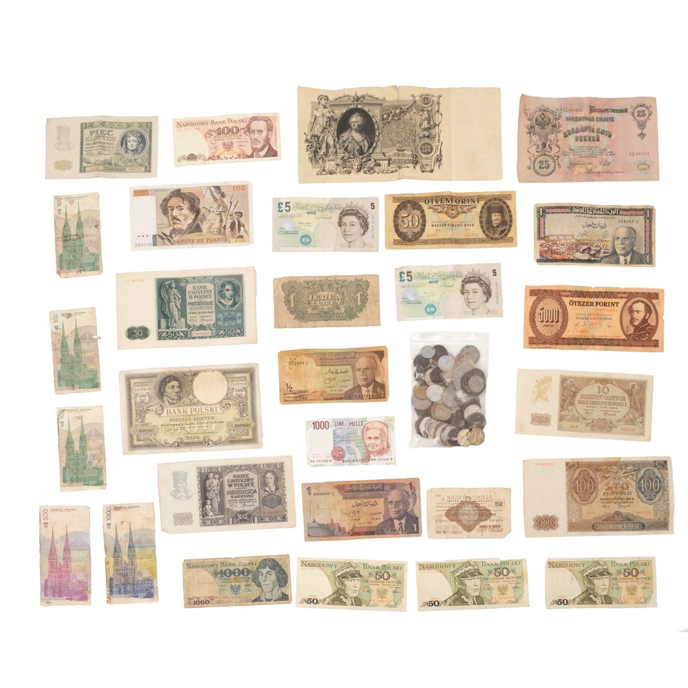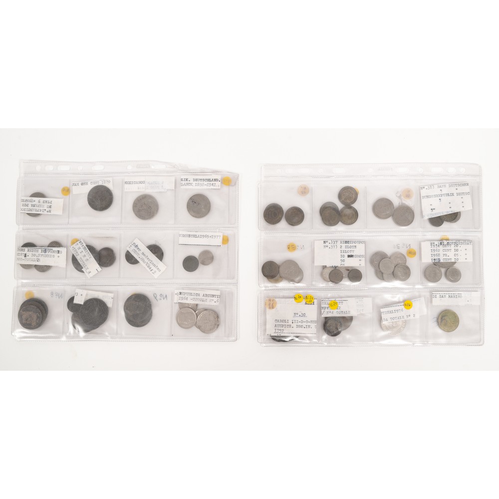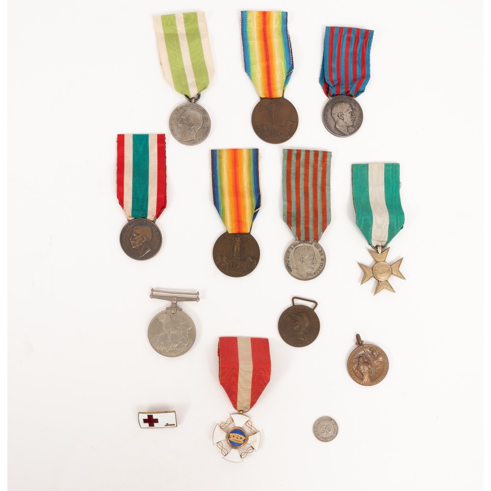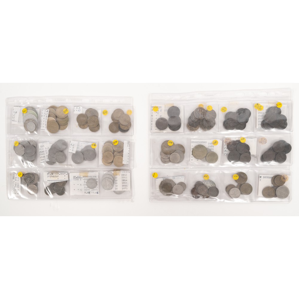 Lotto eterogeneo composto da due centinaia circa di monete di tutto il mondo in fogli d'album e due sacchettini, 25 banconote di tutto il mondo e un'interessante selezione di 9 medaglie e onoreficenze del Regno d'Italia con presenze in argento e bronzo con nastrini.