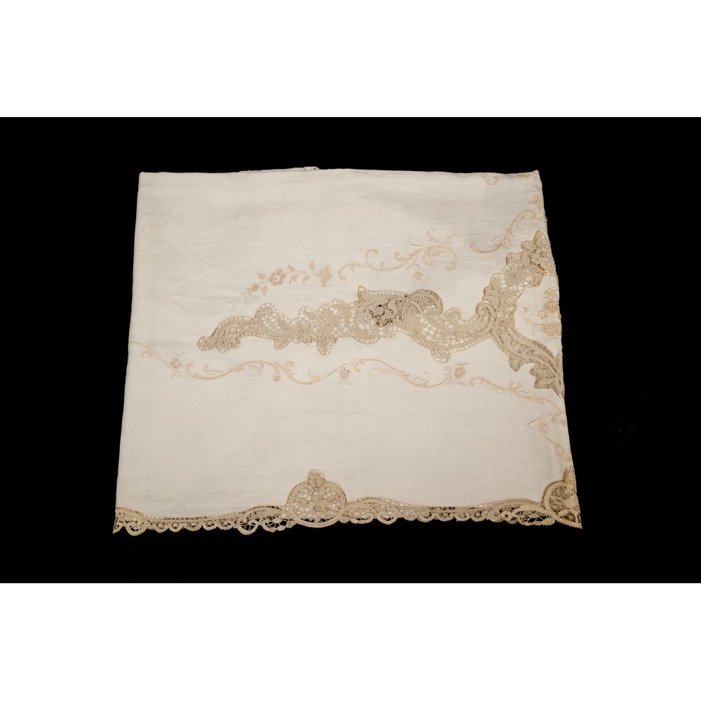 COPRILETTO in lino con ricami a mano nei toni del beige (macchie).