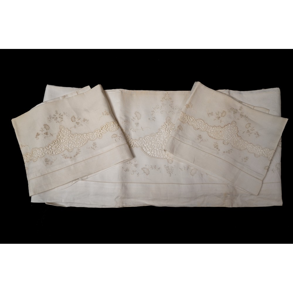 LENZUOLO matrimoniale e due federe in lino con ricami a mono nei toni del bianco (macchie).