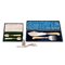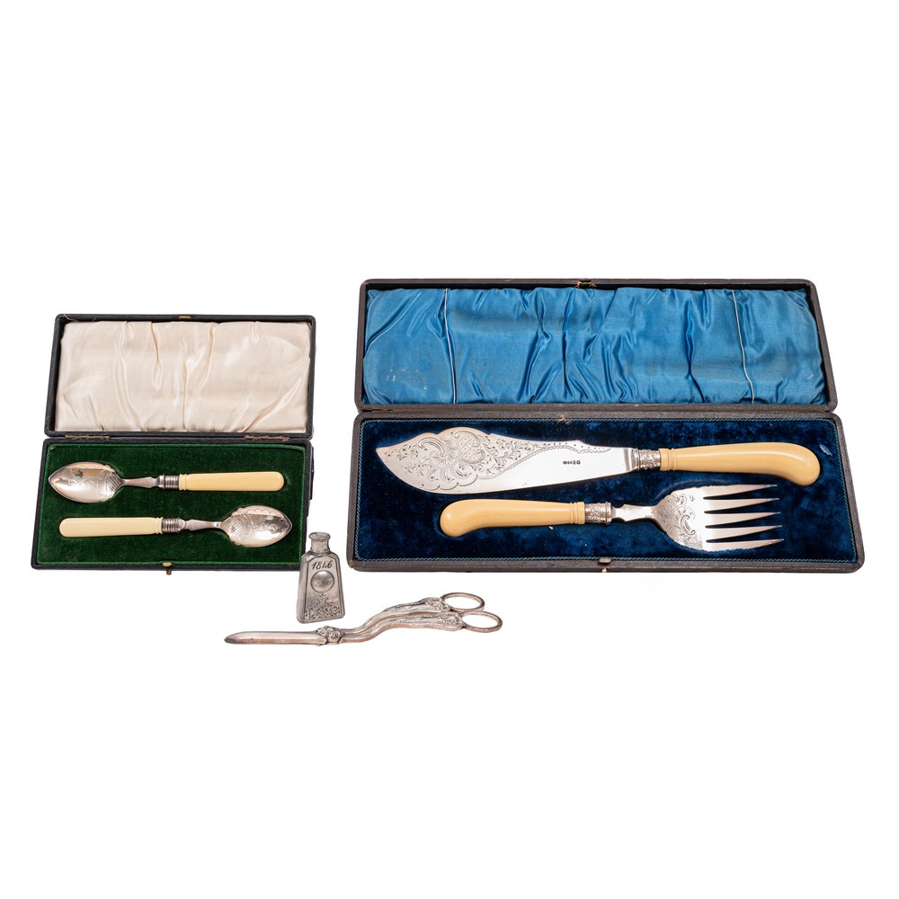 Cofanetto con due cucchiai in metallo con manici in osso, cofanetto con forchettina e coltello da pesce in metallo e manici in osso, forbici in metallo e portaoppio in metallo argentato.