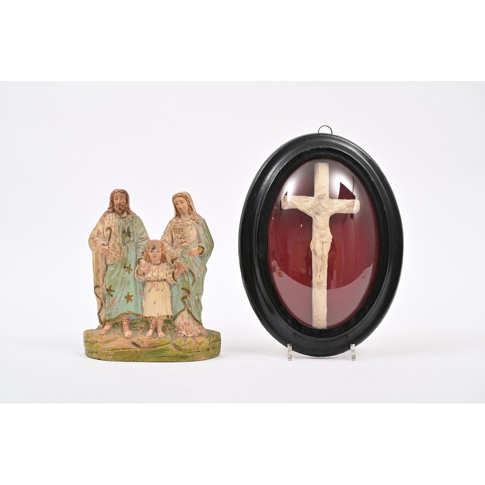 Crocifisso in schiuma di gesso e scultura raffigurante la Sacra Famiglia in terracotta policroma.