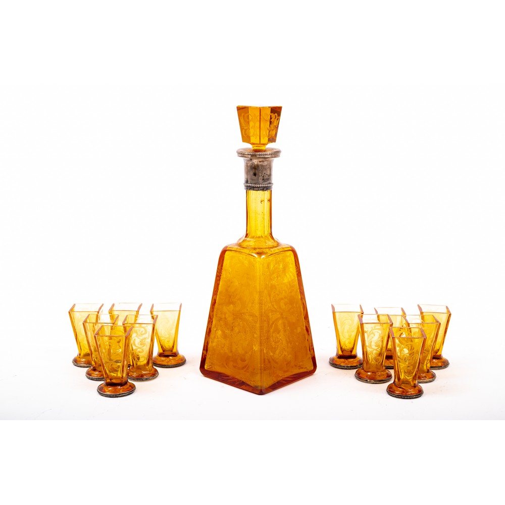 SERVIZIO DA ROSOLIO in vetro composto da bottiglia e dodici bicchierini nei toni dell'ambra.