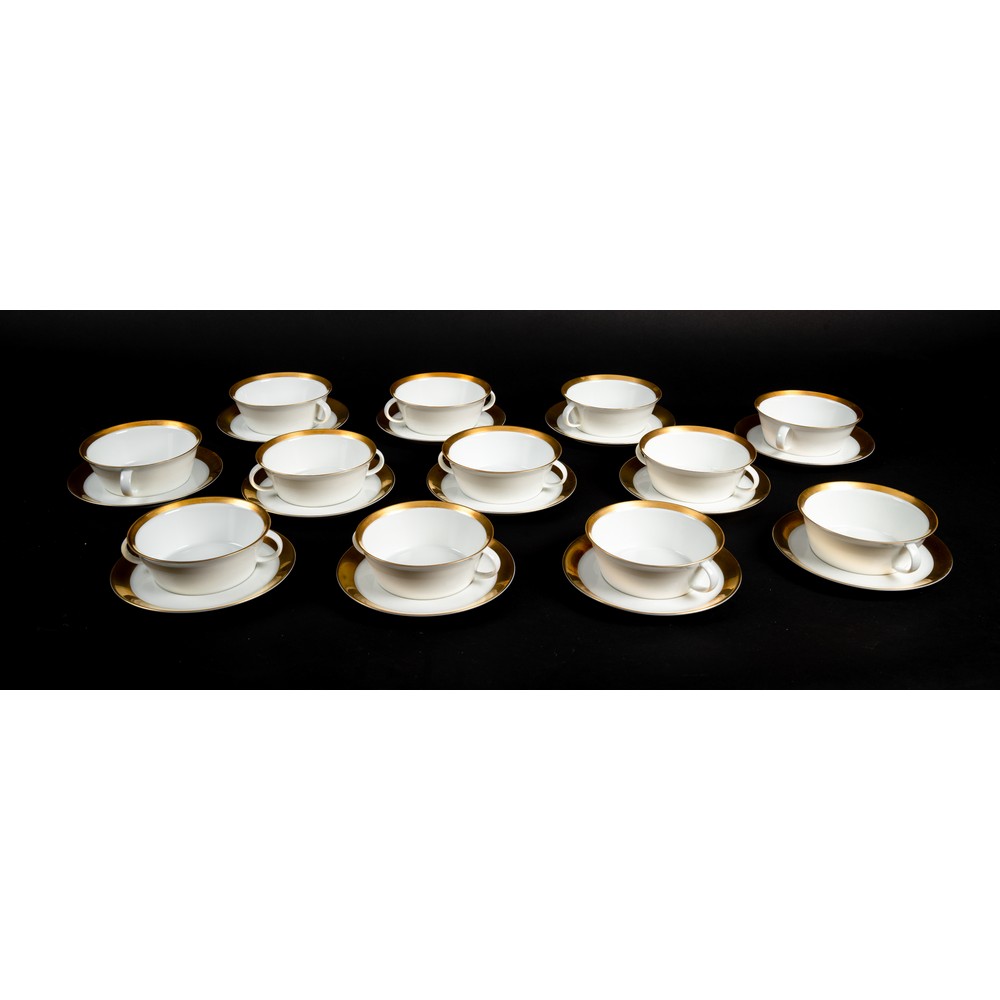 Servizio da consommè in porcellana bianca con decori in oro composto da 12 tazzine con piattino.