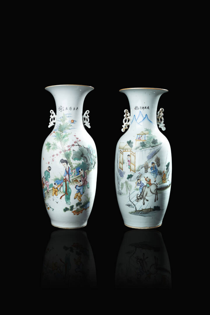 Coppia di vasi in porcellana con decori di personaggi e iscrizioni al retro, Cina, XX secolo.