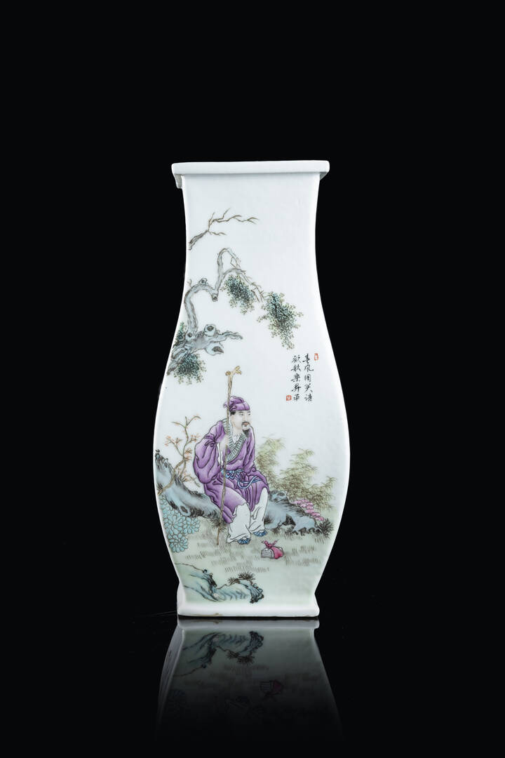 Vaso in porcellana Famiglia Rosa sezione squadrata con dipinti di saggi e iscrizioni, Cina, Repubblica, XX secolo.
