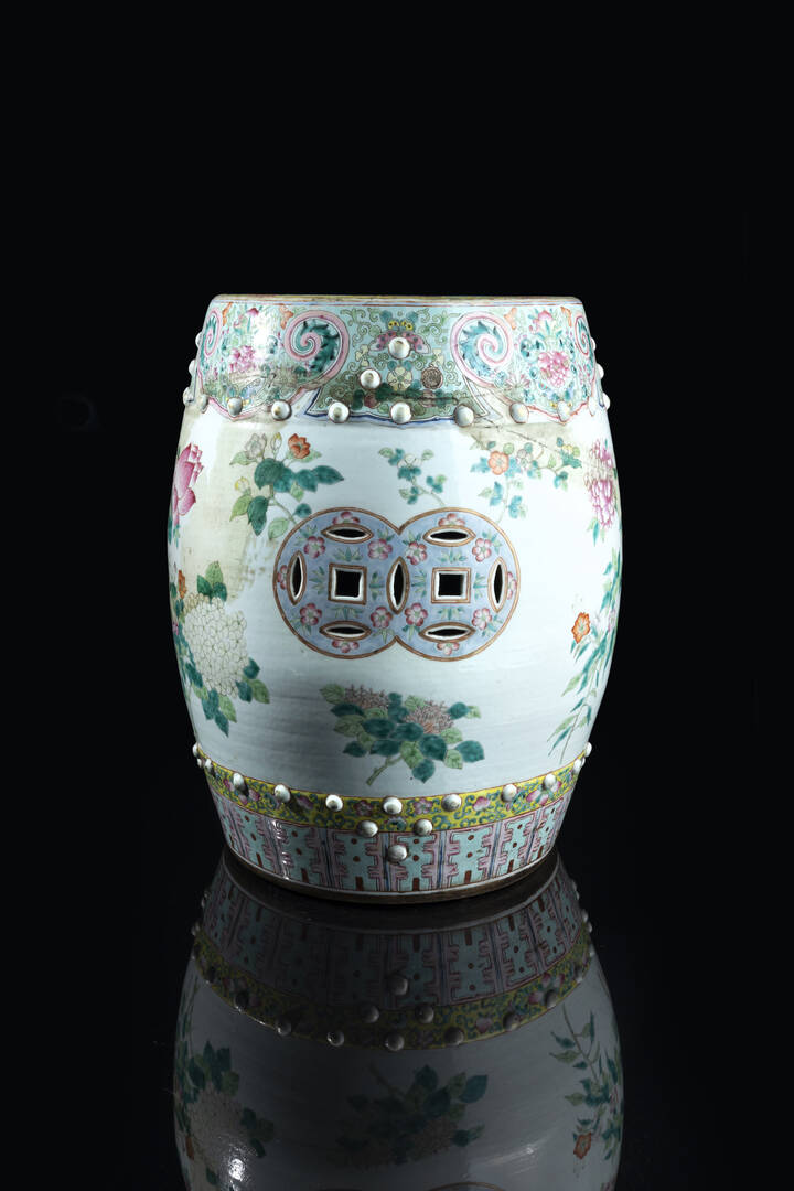 Garden sit in porcellana Famiglia Rosa con decori floreali, Cina, XIX secolo.