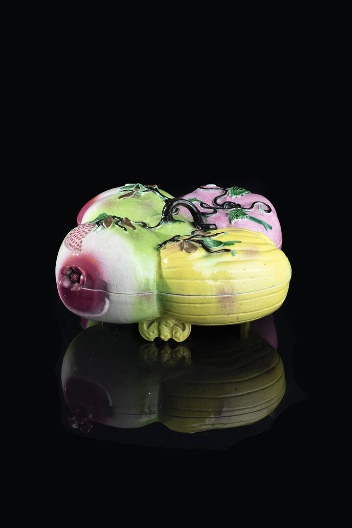 Porta vivande in porcellana policroma con coperchio, Cina, XX secolo.