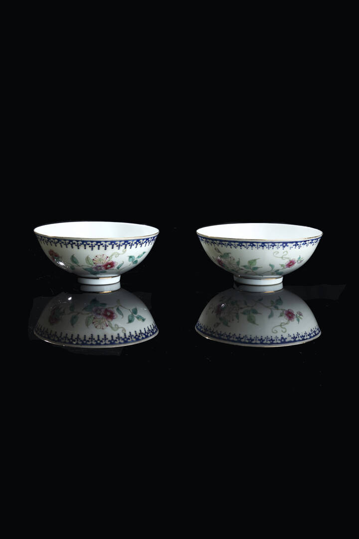 Coppia di ciotole in porcellana con decori floreali, Cina, dinastia Qing, XX secolo.
