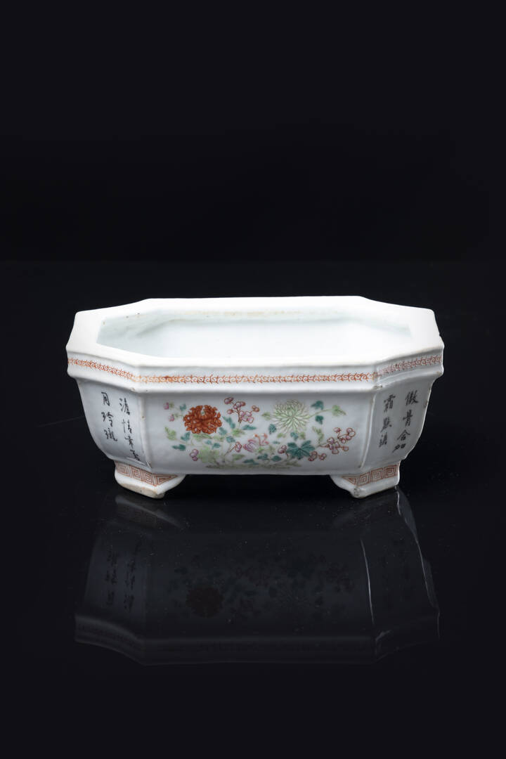 Fioriera in porcella decorata con fiori e iscrizioni, Cina, XIX secolo.