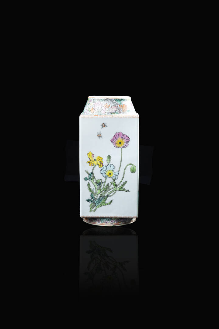 Vaso a sezione quadrata in porcellana Famiglia Rosa a smalti policromi con decoro naturalistico, Cina, Repubblica, XX secolo.